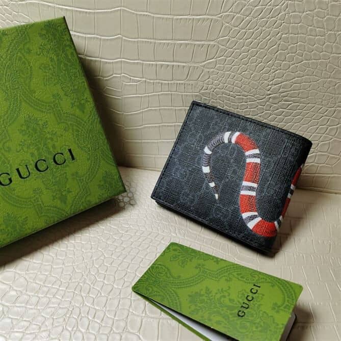 The Gucci Kingsnake Print GG Supreme Wallet is a testament to Gucci’s bold and artistic approach to luxury fashion. It features multiple compartments for cards, bills, and receipts, ensuring practicality without compromising on style.