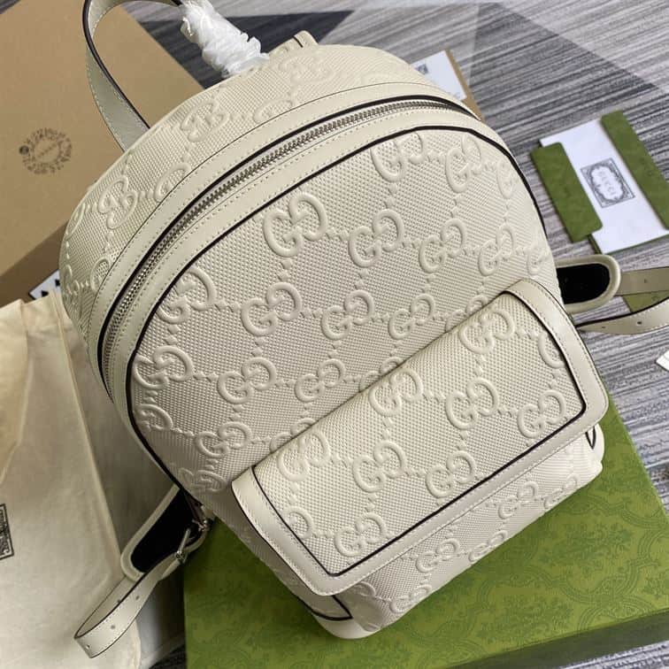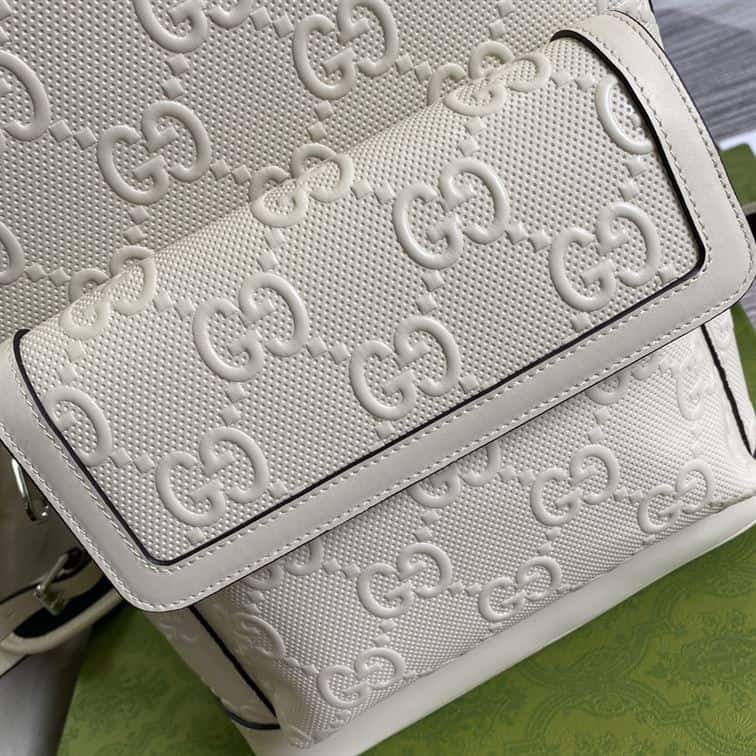 - The Gucci Logo Embossed Perforated Leather Backpack is a striking and contemporary accessory that showcases Gucci’s fusion of luxury and modern design. Its spacious interior is complemented by practical compartments, offering ample storage for everyday essentials.