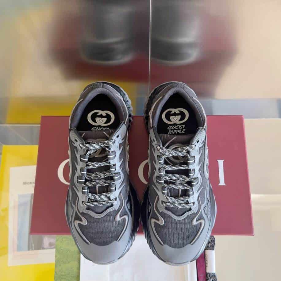 The Gucci Ripple Splash Black Grey Fabric Sneakers replica offers a modern and edgy take on luxury footwear, blending bold black and grey tones with ripple splash fabric accents for a striking visual appeal. Designed for comfort and style, these sneakers perfectly emulate Gucci’s signature aesthetic at an accessible price point. Whether you’re pairing them with casual wear or dressing up for a sleek, contemporary look, these replicas are a versatile and fashionable choice. Elevate your outfit effortlessly with this high-quality, affordable alternative to designer sneakers.