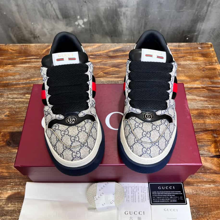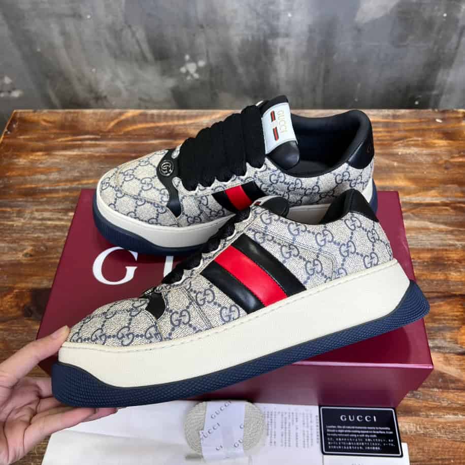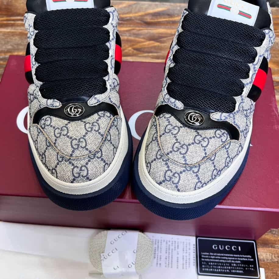 Drawing inspiration from ’70s sportswear, the Screener combines a low-top silhouette with nostalgic details like muted tones and aged effects, giving it a unique, lived-in aesthetic. Crafted with premium materials for both comfort and durability. The Gucci Screener Web Beige and Blue Sneaker is perfect for those who love blending retro style with high-fashion flair.