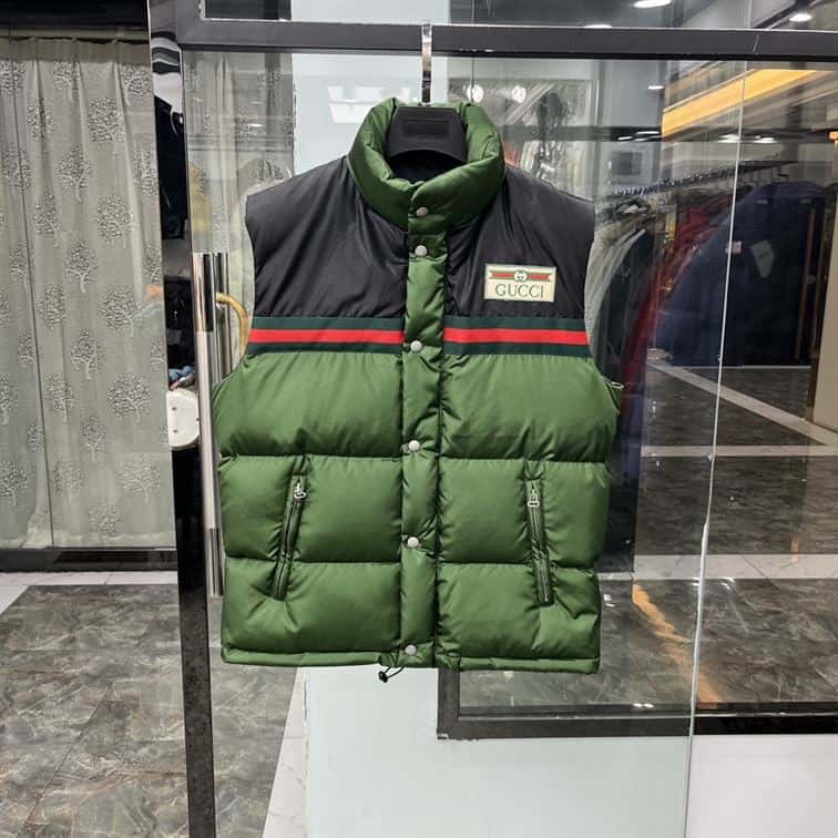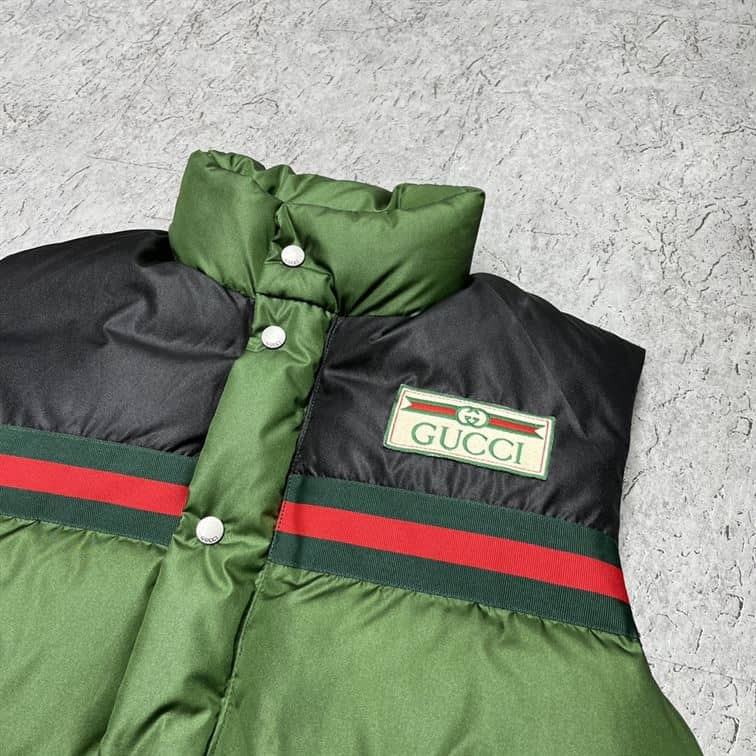 #GucciStyle#WebStripeFashion#PaddedDownGilet#DesignerOuterwear#LuxuryApparel