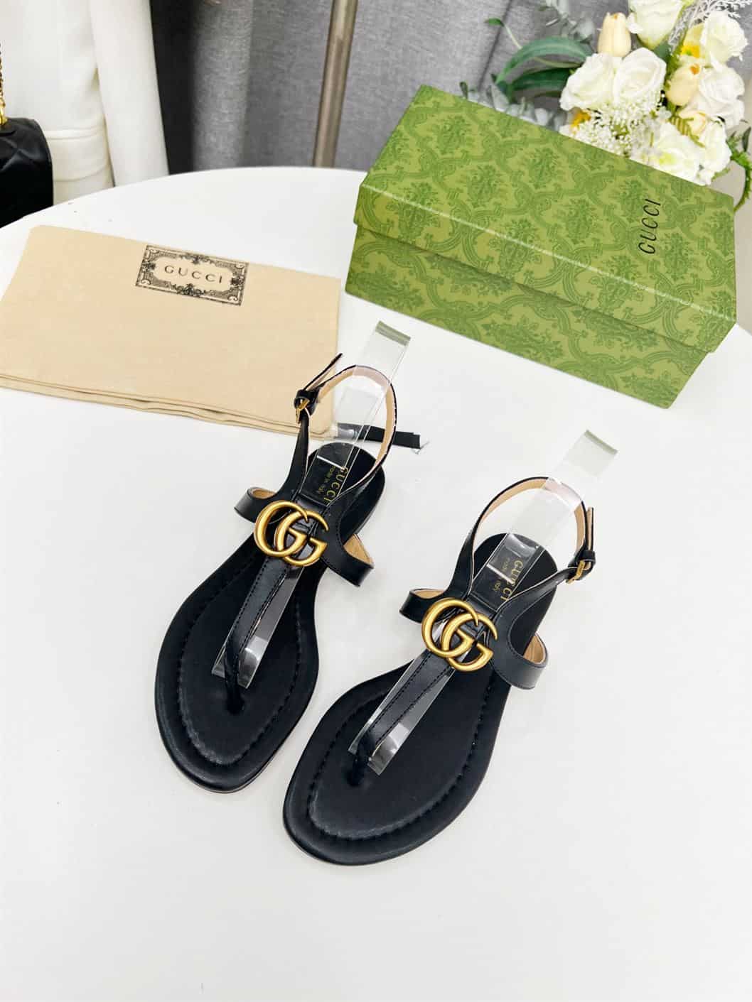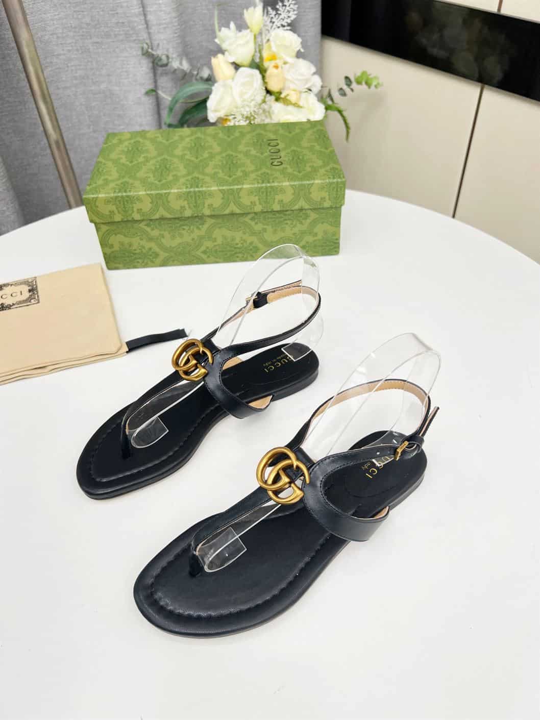 GUCCI WOMEN’S DOUBLE G THONG SANDAL BLACK LEATHER – GSL021