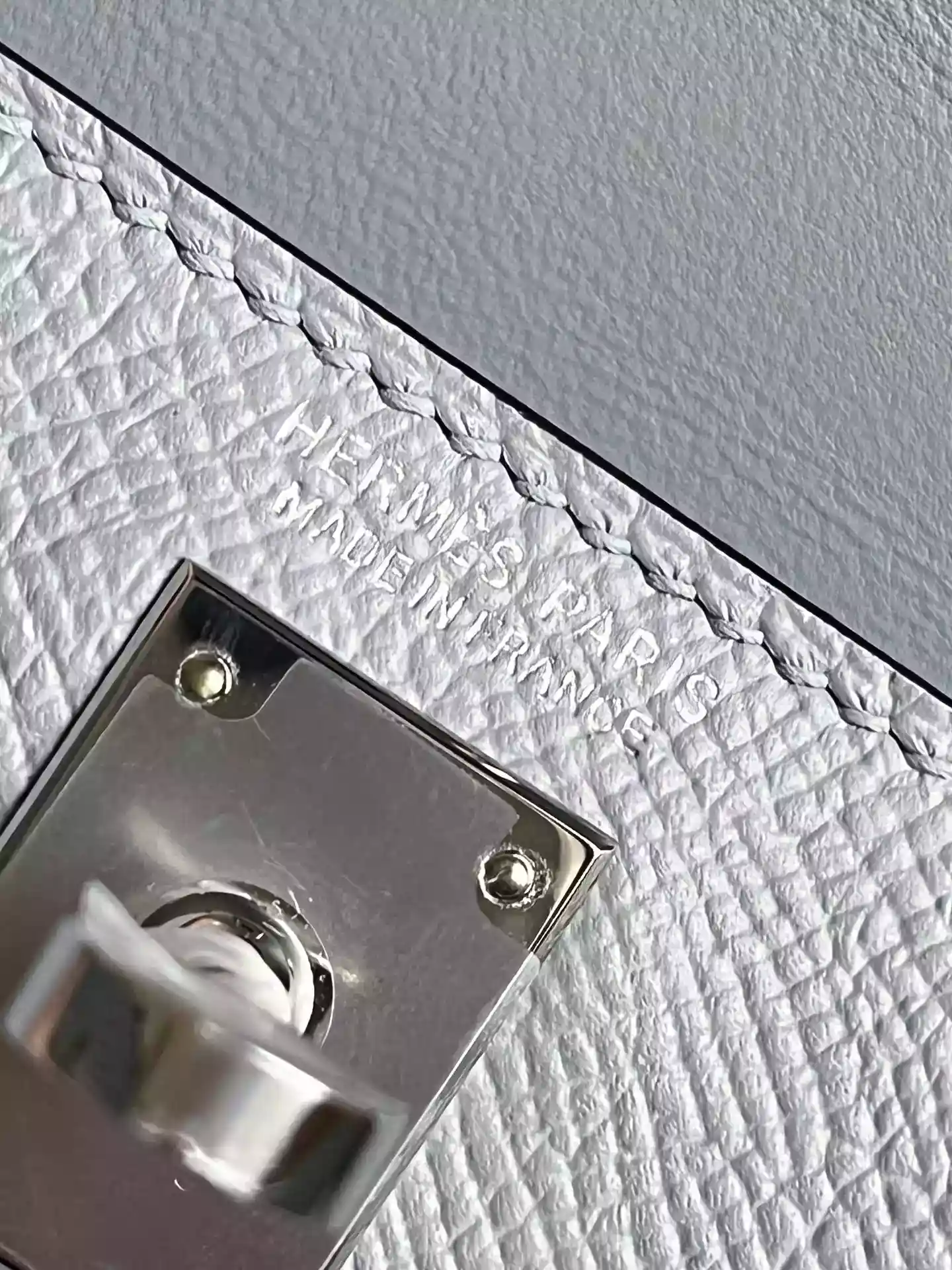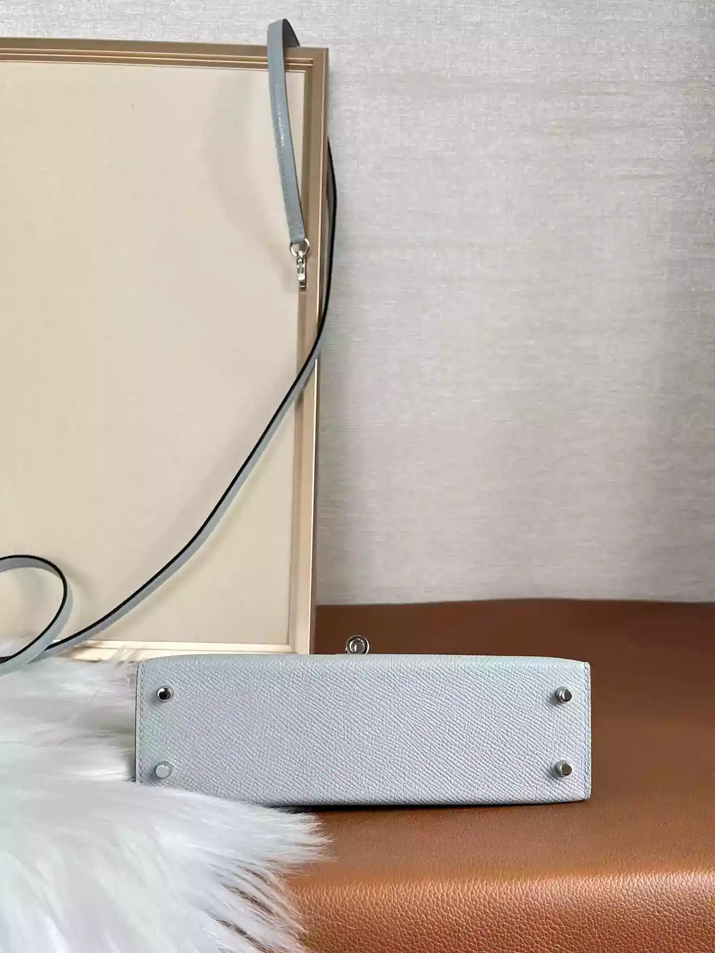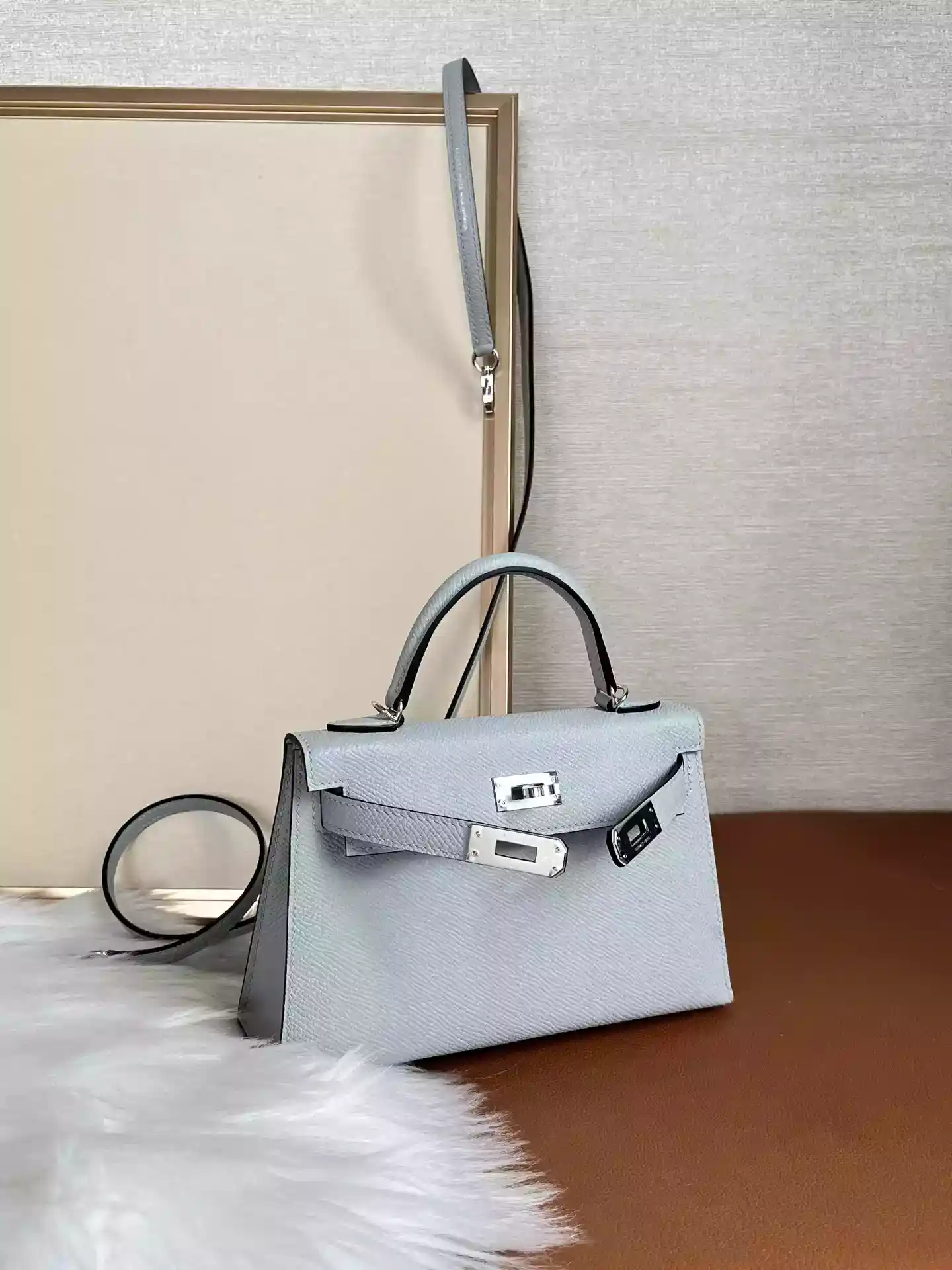 Experience the timeless elegance of the Hermès Bleu Glacier Epsom Mini Kelly 20 II Palladium Hardware ; HW191, a true collectsor’s piece crafted from durable Epsom leather in a delicate icy blue hue.