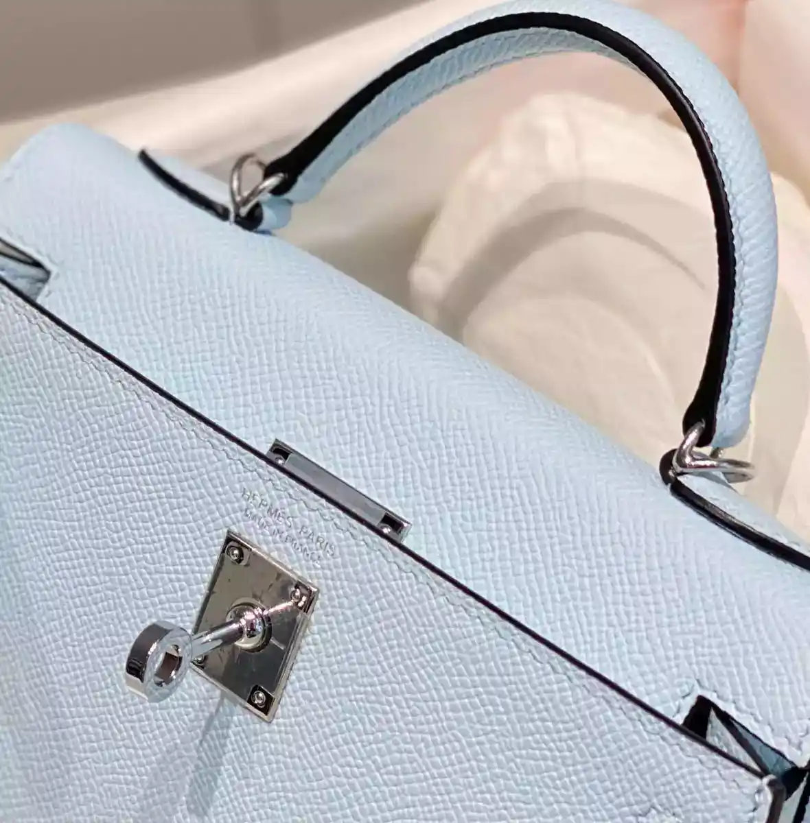 Hermes Kelly Mini II Bag In Blue Brume Epsom Leather PHW ; HW126