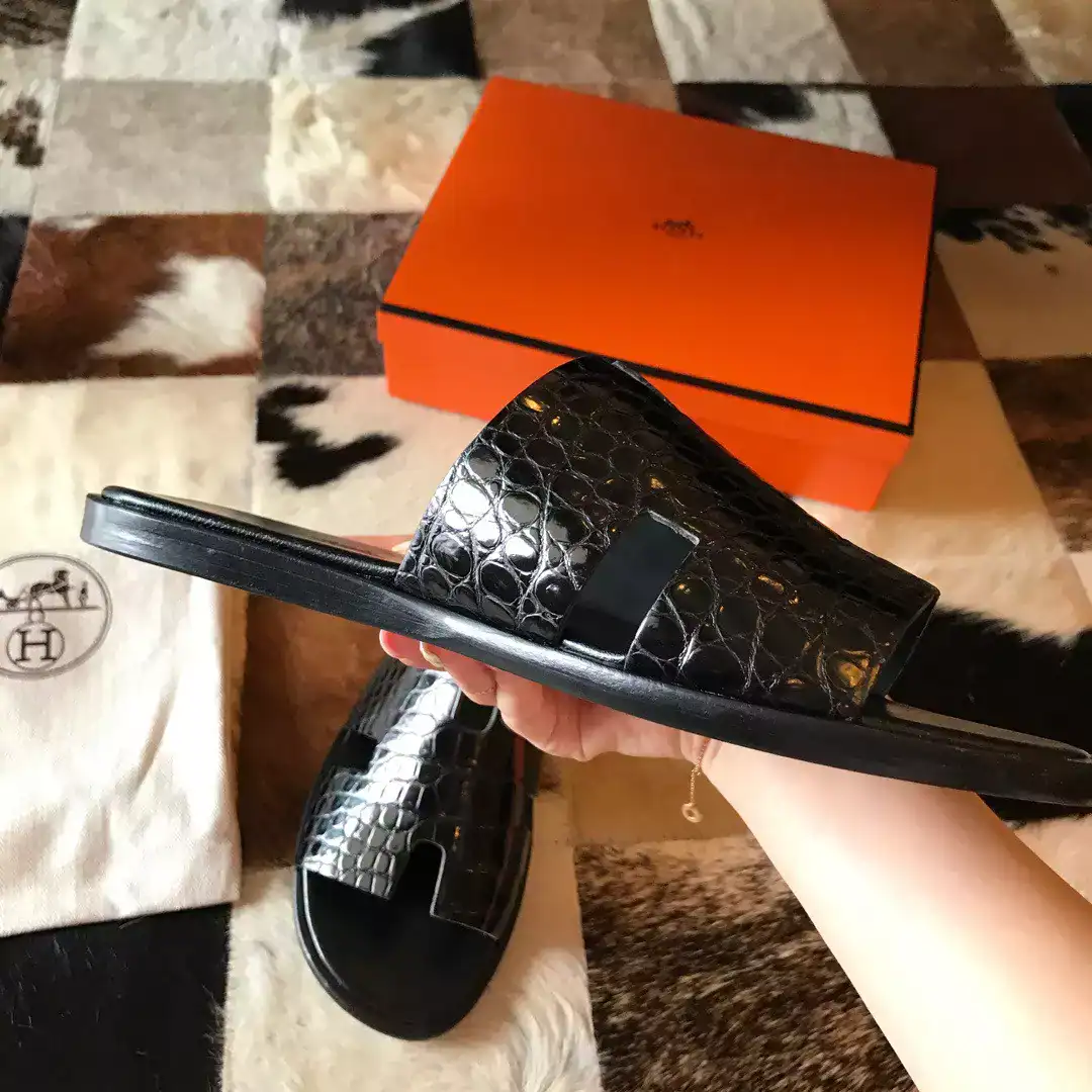 HERMES MEN’S IZMIR SANDALS IN BLACK SHINY NILOTICUS CROCODILE LEATHER ; HMSD034