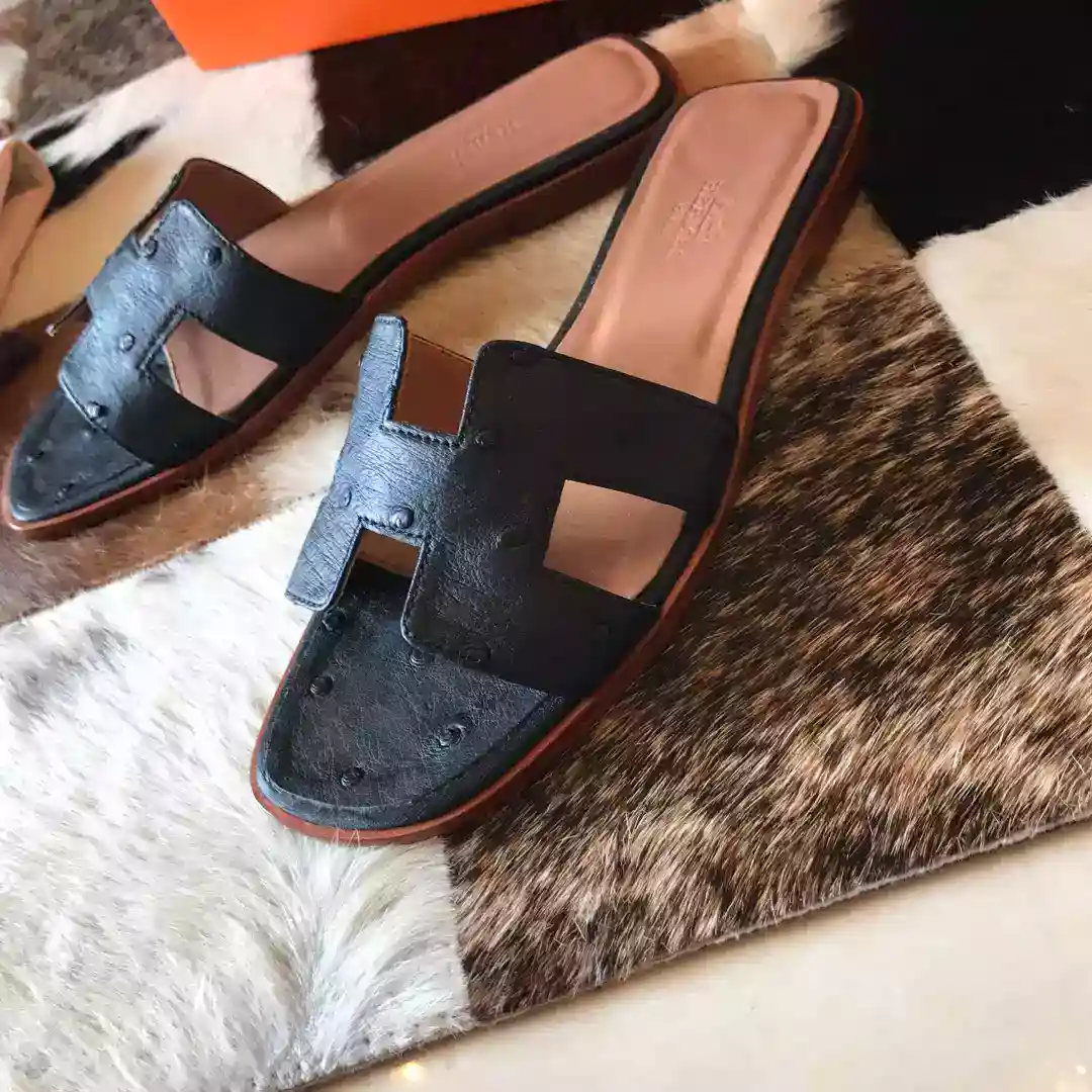 HERMES ORAN SLIDE SANDALS IN BLACK OSTRICH LEATHER ; HMSD078