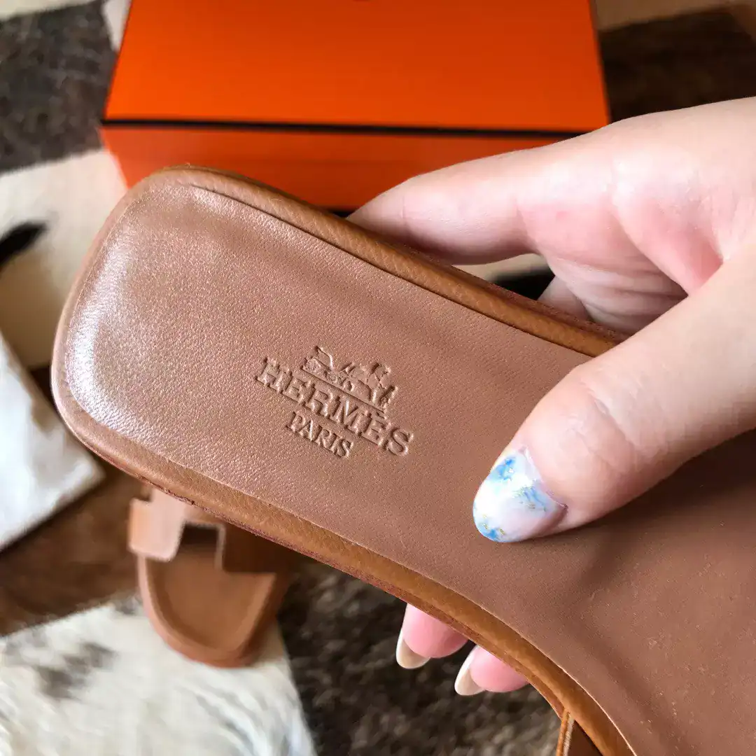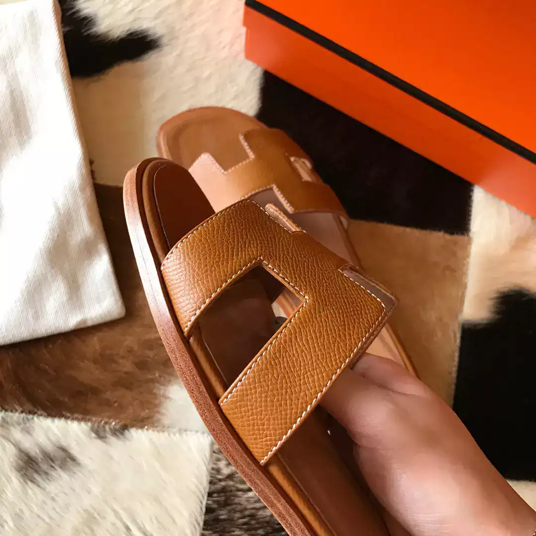 HERMES ORAN SLIDE SANDALS IN BROWN EPSOM CALFSKIN ; HMSD071