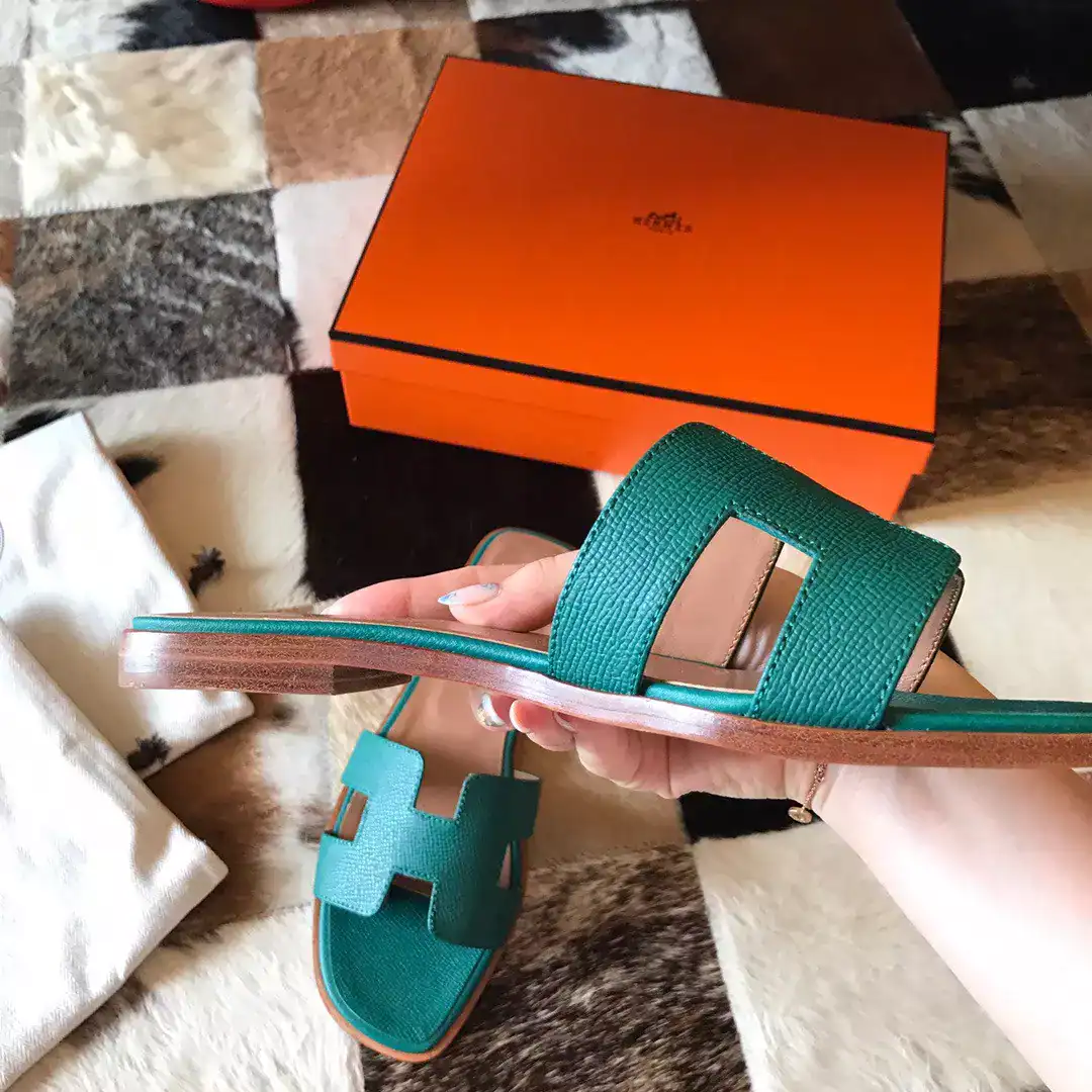 HERMES ORAN SLIDE SANDALS IN MALACHITE EPSOM CALFSKIN ; HMSD075