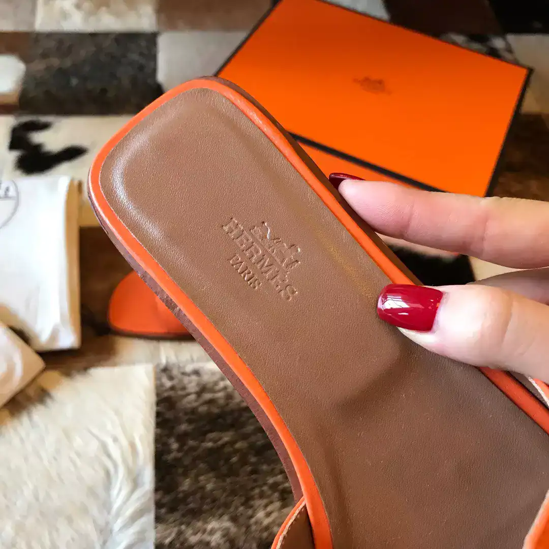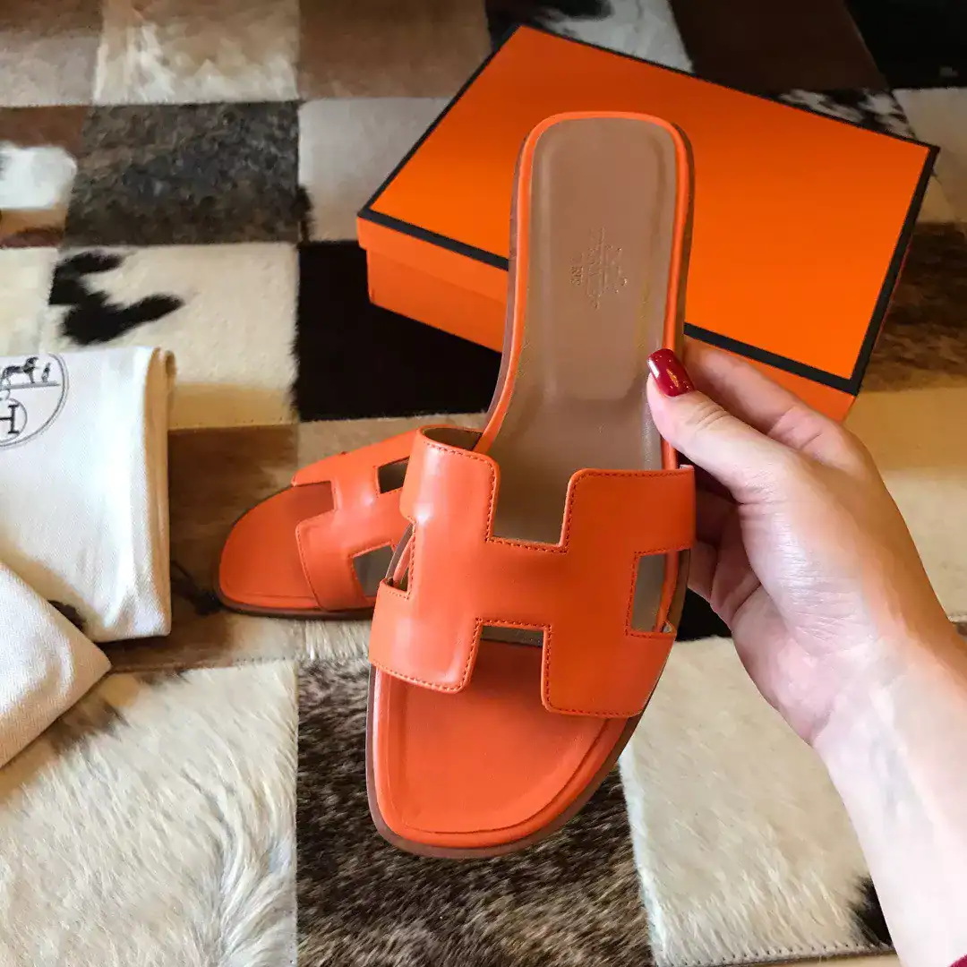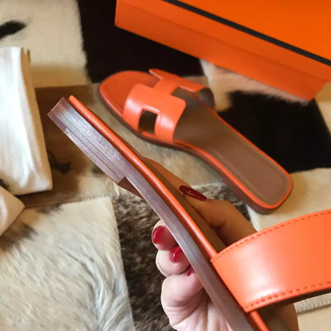 HERMES ORAN SLIDE SANDALS IN ORANGE SWIFT CALFSKIN ; HMSD115