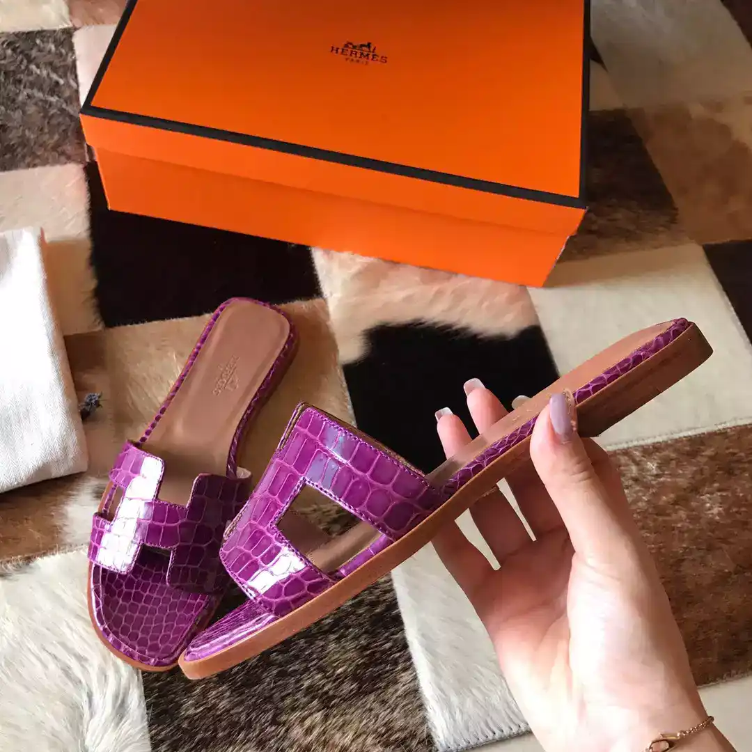 HERMES ORAN SLIDE SANDALS IN PURPLE SHINY NILOTICUS CROCODILE SKIN ; HMSD054