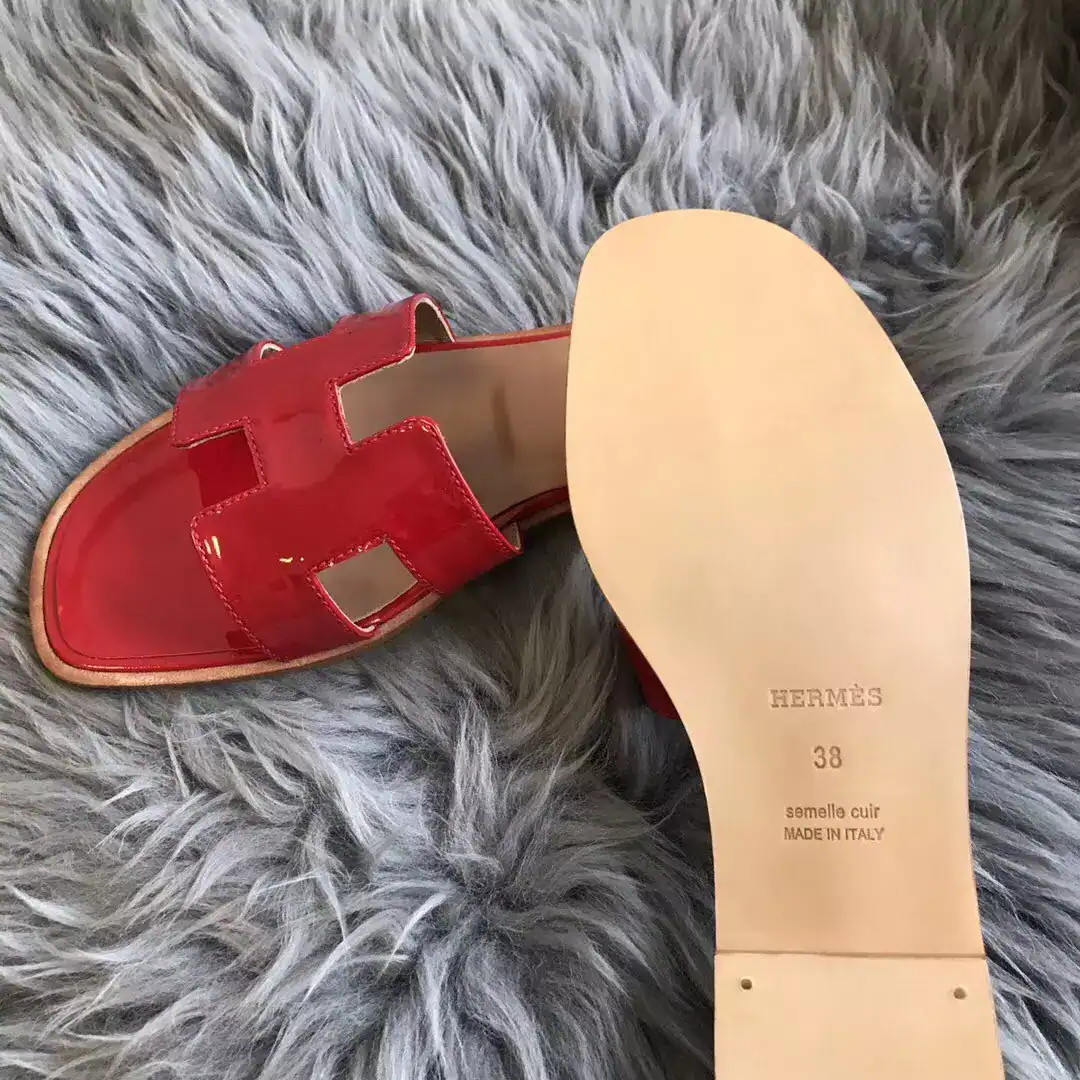 HERMES ORAN SLIDE SANDALS IN RED PATENT CALFSKIN ; HMSD084