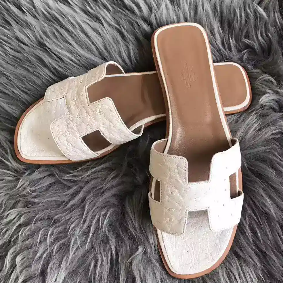 HERMES ORAN SLIDE SANDALS IN WHITE OSTRICH LEATHER ; HMSD082