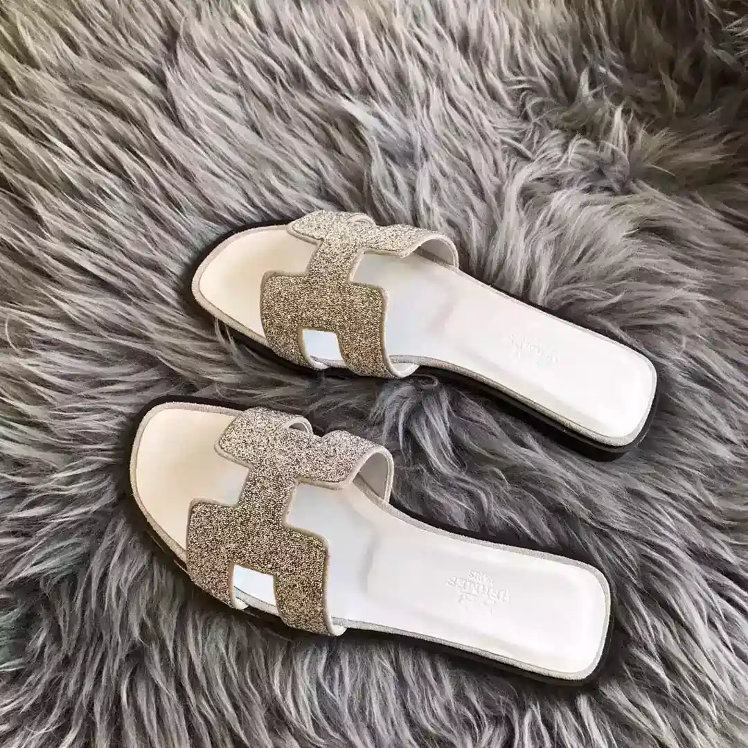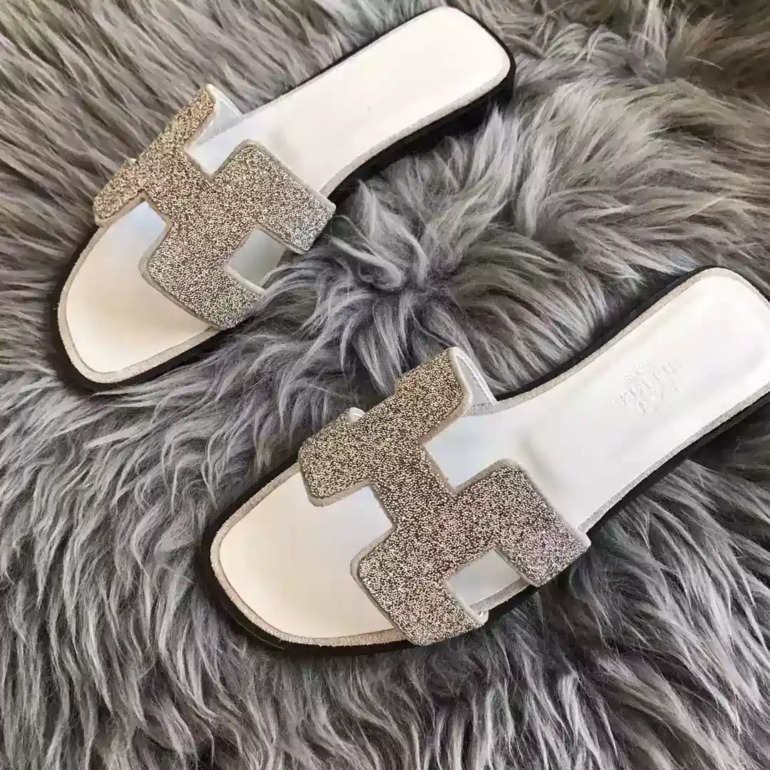 HERMES ORAN SLIDE SANDALS IN WHITE SUEDE WITH CRYSTAL ; HMSD109