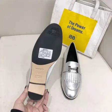 SKU: HM087 Categories: FOOTWEAR, HERMES, LOAFER AND DRIVER, Women Tags: Lambskin Slip-On Shoes, Luxury Silver Loafers, Metallic Leather Footwear