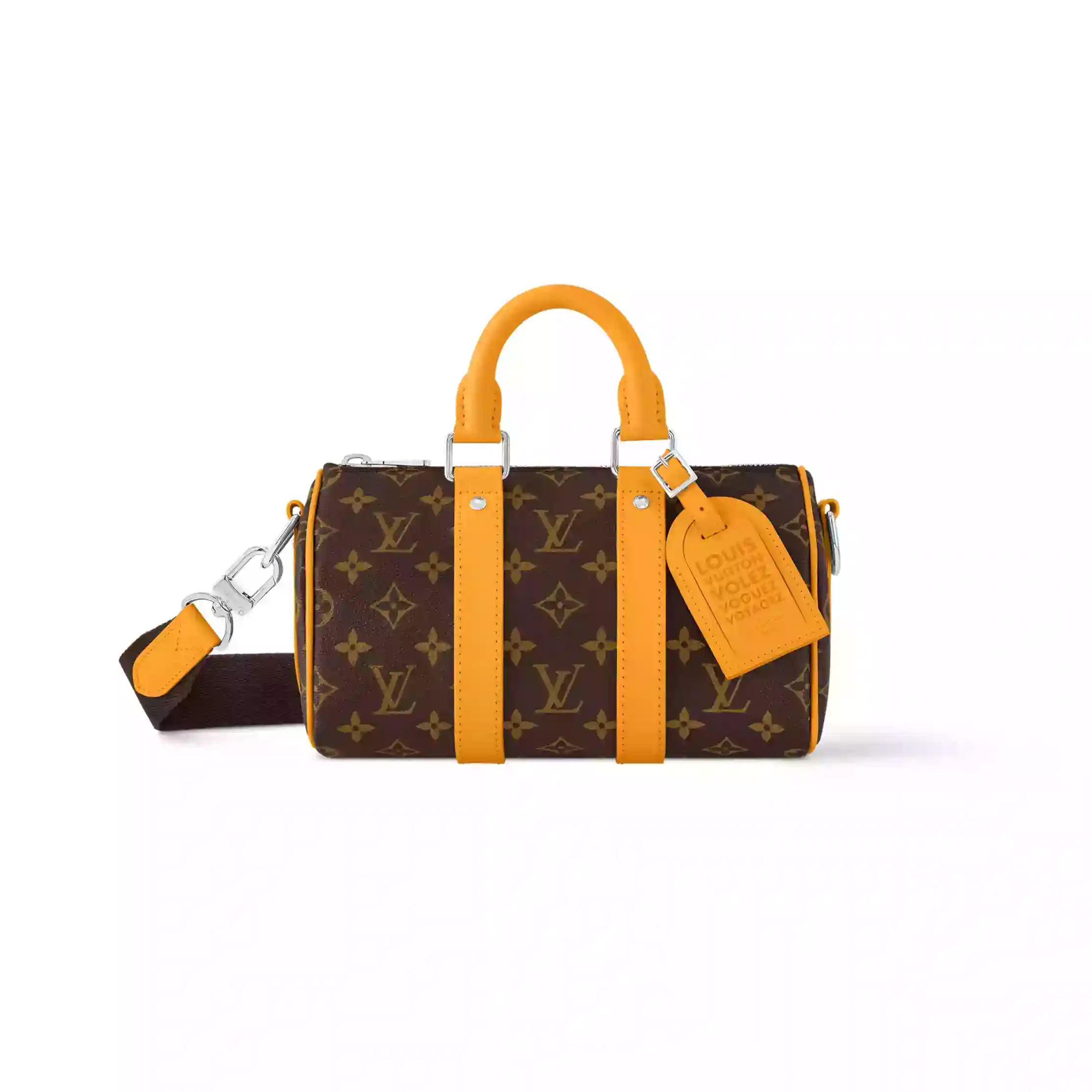 Discover the iconic Louis Vuitton Keepall Bandouliière 25 Bag in Safran Yellow Monogram Macassar.