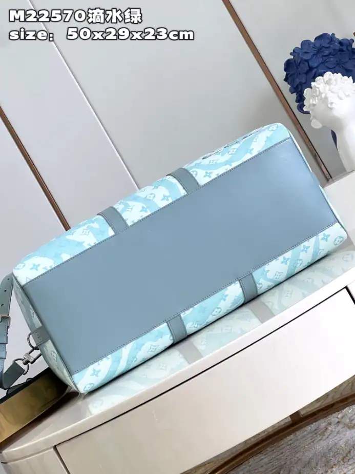 Discover the perfect blend of style and practicality with the KEEPALL BANDOULIERE 50 BAG IN MONOGRAM AQUAGARDEN M22570