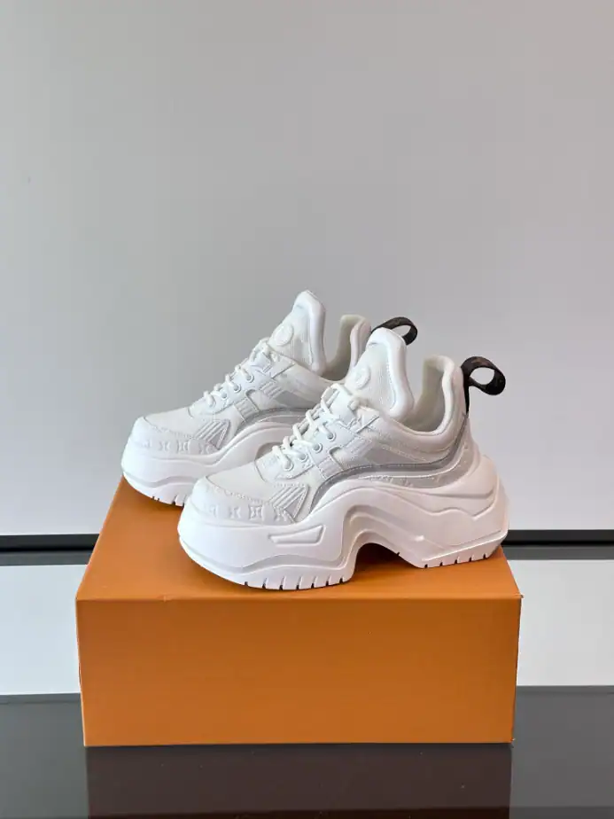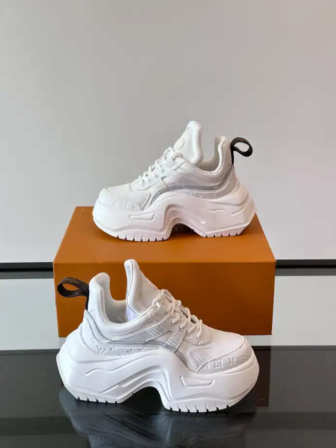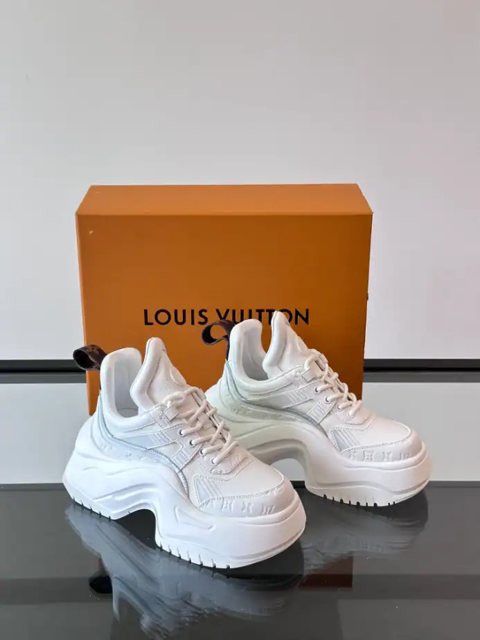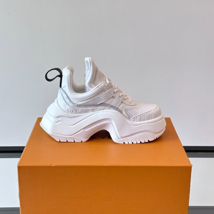 - The Louis Vuitton Archlight Sneaker is a bold, fashion-forward design that blends high-performance with luxury aesthetics. Featuring a futuristic silhouette, the Archlight sneaker is instantly recognizable by its oversized, curved sole and sleek, dynamic lines. Crafted from premium materials such as supple leather and durable technical fabric, this sneaker offers both comfort and style. Its distinctive, sporty design incorporates a mix of smooth and perforated textures, with the iconic Louis Vuitton monogram subtly embossed on the side.