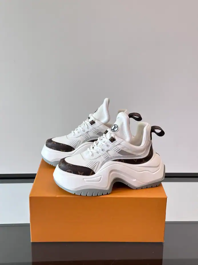 - The Louis Vuitton Archlight Sneaker is a bold, fashion-forward design that blends high-performance with luxury aesthetics. Featuring a futuristic silhouette, the Archlight sneaker is instantly recognizable by its oversized, curved sole and sleek, dynamic lines. Crafted from premium materials such as supple leather and durable technical fabric, this sneaker offers both comfort and style. Its distinctive, sporty design incorporates a mix of smooth and perforated textures, with the iconic Louis Vuitton monogram subtly embossed on the side.