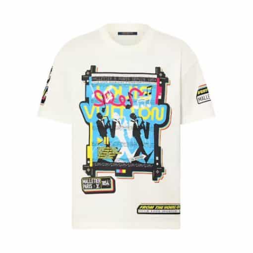 Introducing the Louis Vuitton LV Jazz Flyers Short-Sleeved T-Shirt, a fusion of iconic LV motifs with vibrant jazz-inspired graphics. Elevate your wardrobe with this statement piece from Louis Vuitton, combining luxury and artistic flair effortlessly.