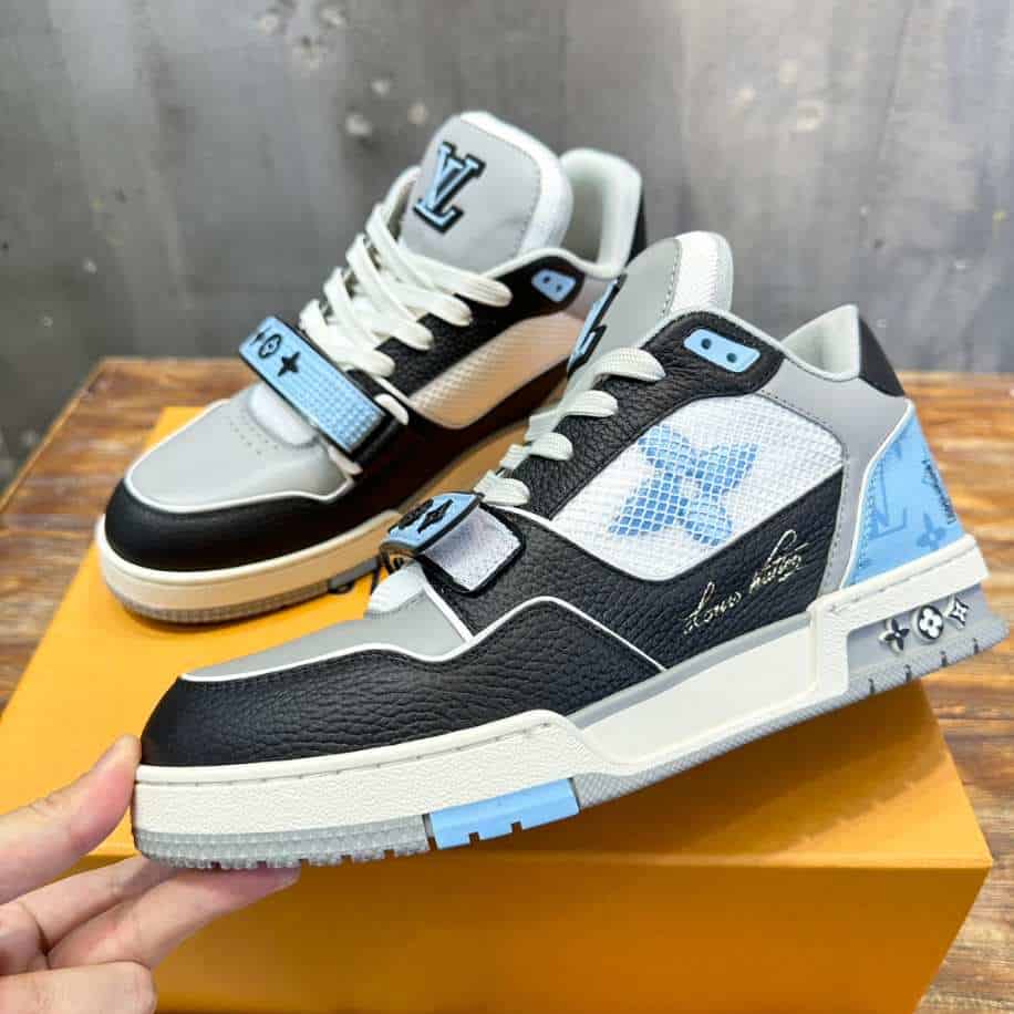 - The Louis Vuitton Trainer Blue Grey Black Sneaker is a dynamic blend of bold colors and luxury design. Featuring a mix of blue, grey, and black tones, this sneaker offers a striking, modern aesthetic that’s perfect for the fashion-forward individual.