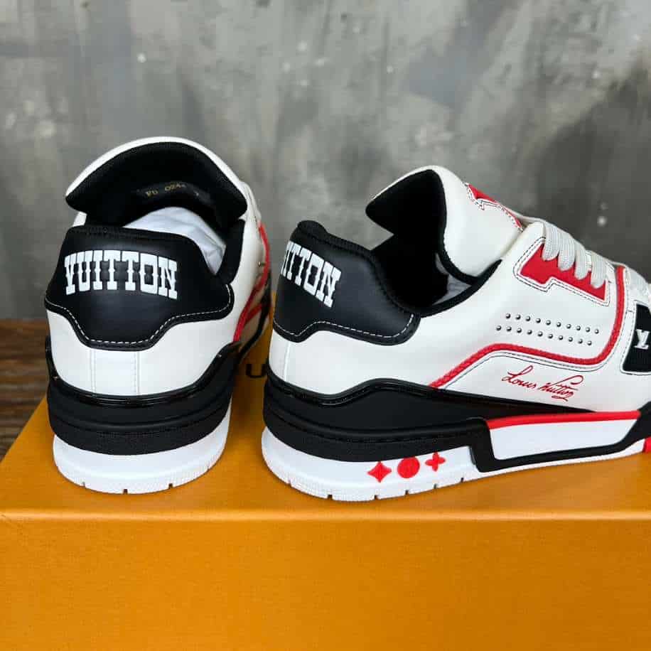 - The Louis Vuitton Trainer White Red Low Sneaker is a stylish and modern take on luxury streetwear. Featuring a sleek white leather upper with striking red accents, these sneakers offer a bold yet refined look.
