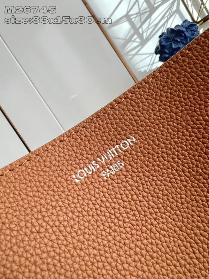 The Verso Tote in LV Touch cowhide leather blends style and versatility. Its reversible design offers two distinct looks: smooth grained leather on one side, and matching-colored suede on the other. Each side features a pocket with a stitched V signature, while a removable suede pouch adds extra functionality.