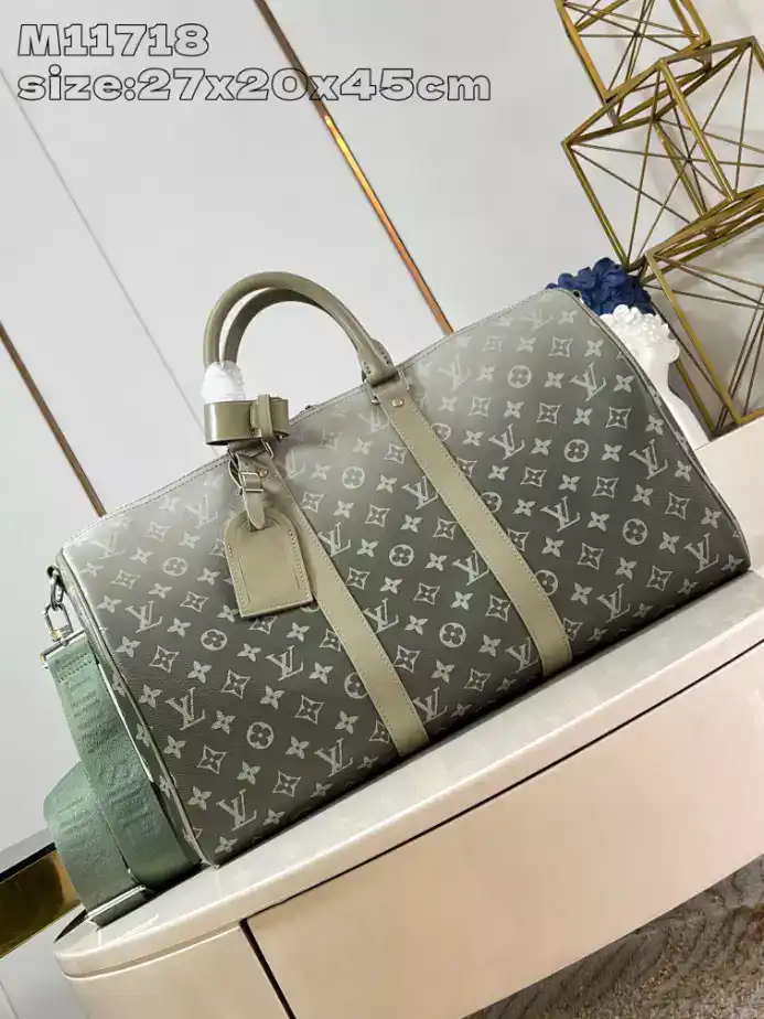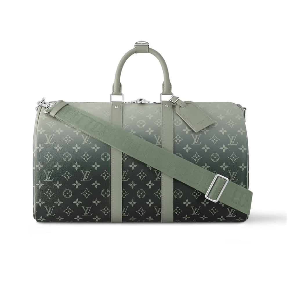 - The Keepall Bandoulière 45 in Khaki Monogram Gradient Canvas is a sophisticated and modern take on the classic Louis Vuitton travel bag. The bag features the iconic Monogram canvas, with a unique gradient effect transitioning from deep khaki to lighter tones, creating a stylish and dynamic look. The 45 cm size is perfect for weekend trips or as an everyday carry, offering ample space for your essentials. With its adjustable, removable shoulder strap and leather handles, this bag combines comfort with convenience. The Keepall Bandoulière 45 in Khaki Monogram Gradient Canvas seamlessly blends timeless luxury with a contemporary twist, making it a standout piece for any discerning traveler.