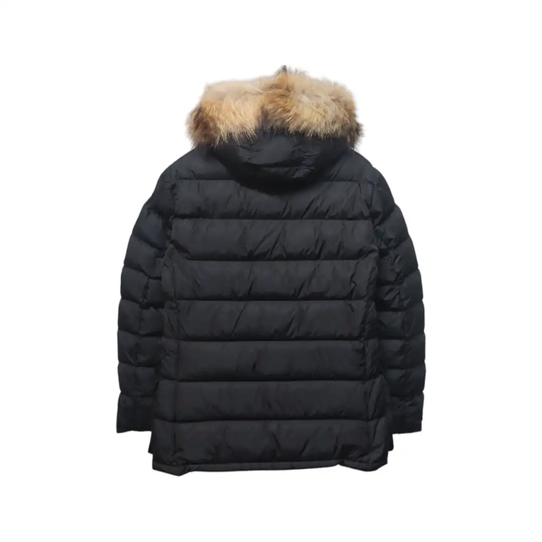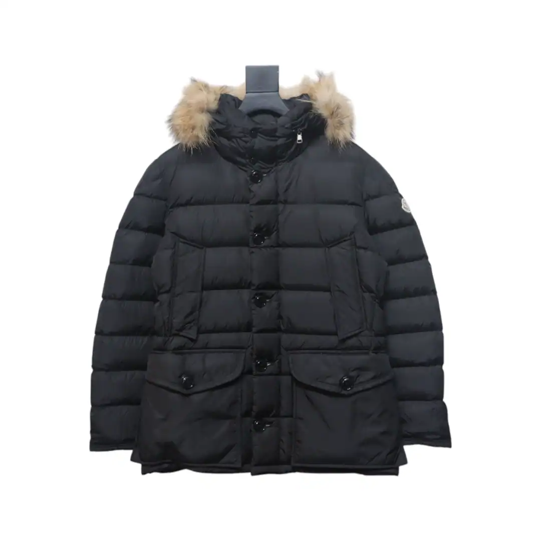 Moncler Mid-Length Hooded Fur Collar Button Down Jacket Black ; MC163