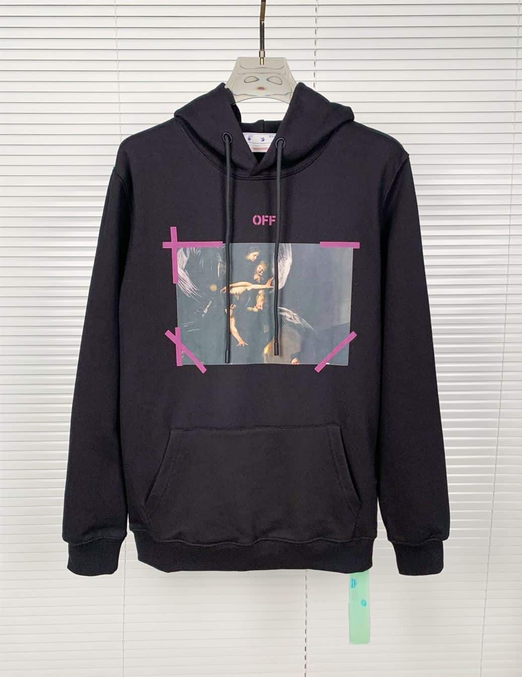 The Off-White Arrow Caravaggio Mercy Skate Hoodie in Black Purple is a bold fusion of high fashion and streetwear. This hoodie features Off-White’s signature arrow motif combined with Caravaggio’s iconic “Mercy” artwork, creating a visually striking design.