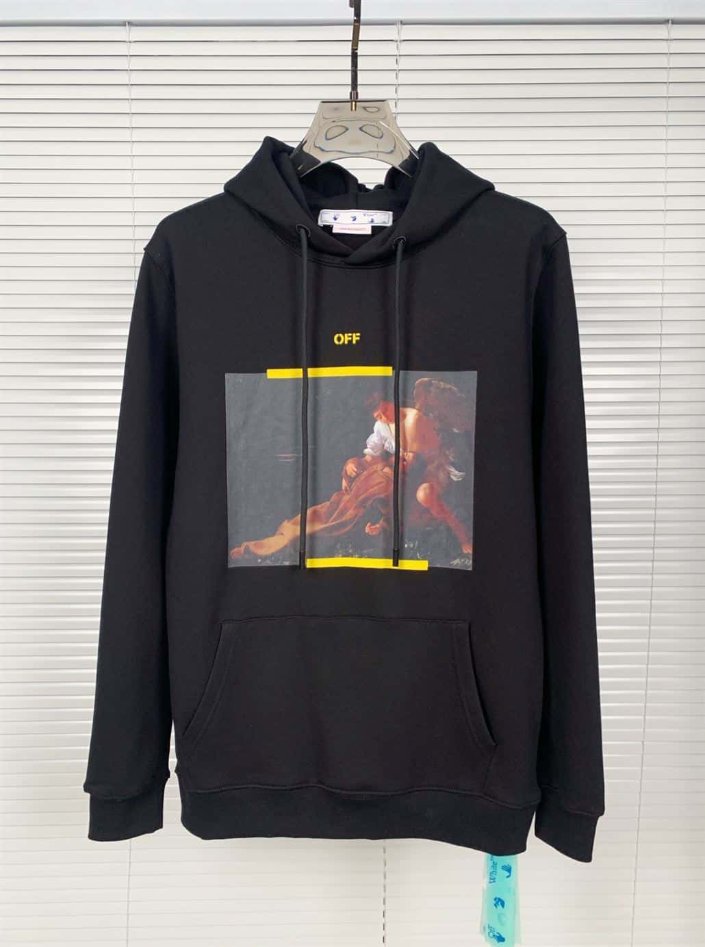 The Off-White Arrow Caravaggio Mercy Skate Hoodie in Black Yellow Multi is a striking fusion of art and streetwear. This hoodie features the iconic Off-White arrow motif alongside Caravaggio’s masterpiece, “Mercy,” creating a bold and visually captivating design.