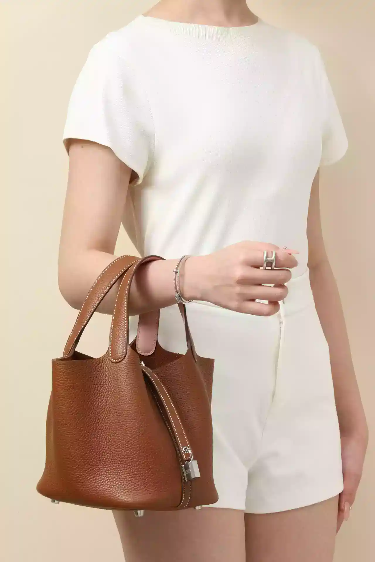 The Picotin Lock 18 features a minimalist bucket silhouette, luxurious texture, and a secure closure that blends style with practicality. Whether you’re elevating a casual outfit or complementing an elegant ensemble, this bag offers both versatility and iconic prestige.