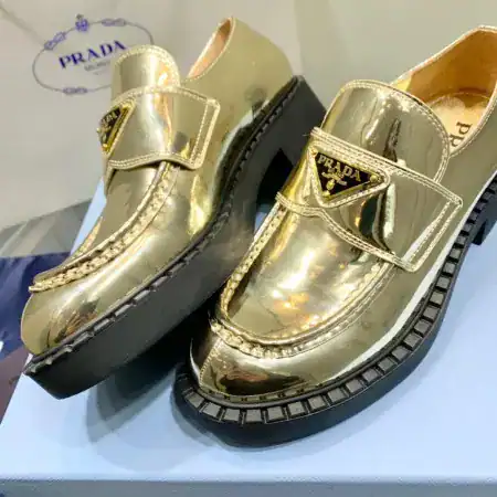 Step into luxury with the Prada Women’s Loafers in stunning gold metallic leather.