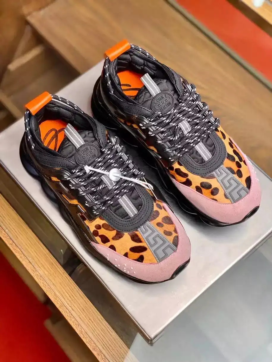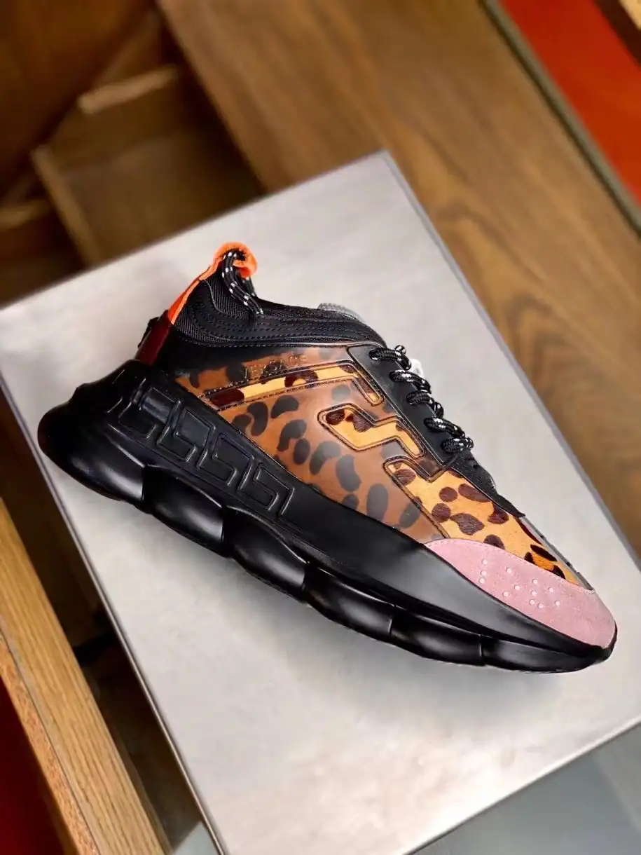 VERSACE WOMEN’S BLACK CHAIN REACTION SNEAKERS WITH LEOPARD PRINT ; VSS027