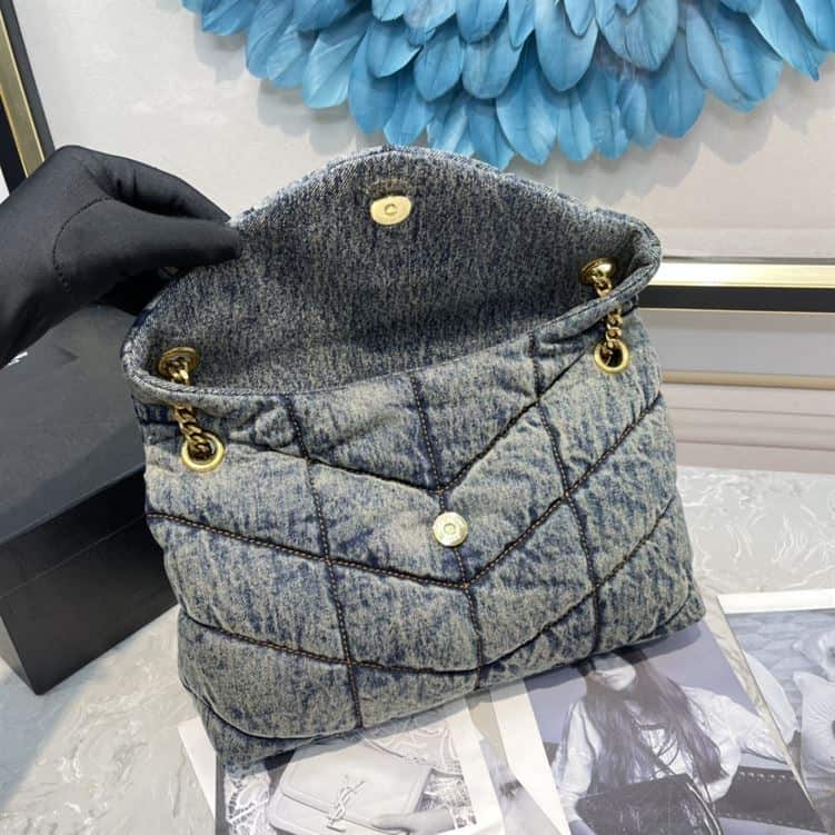 - With its medium size and versatile strap, the Puffer bag offers both practicality and elegance, perfect for those who appreciate luxury and fashion-forward versatility. Ideal for elevating casual or dressed-up looks. The YSL Medium in Suede and Denim is a statement piece that embodies effortless chic.