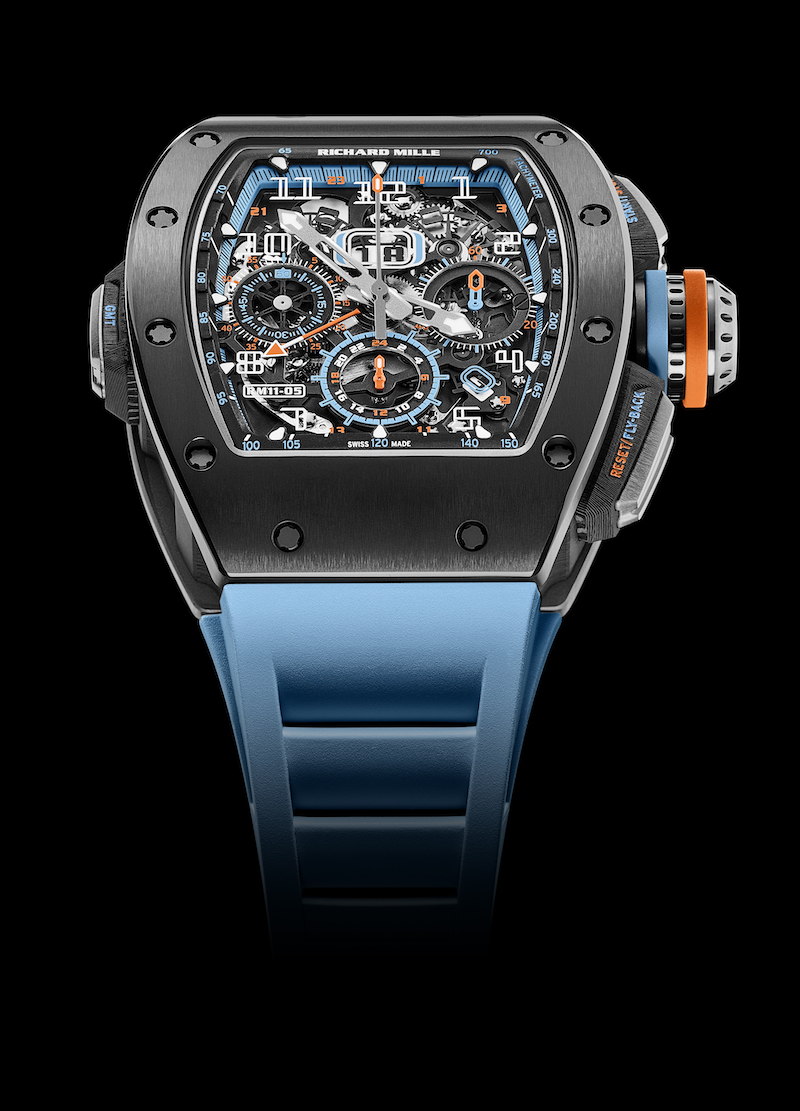 Mille succeeded in this by combining hot stamping with powerful electrical currents. It results in a material whose density is less than that of titanium, while at 2,360 Vickers, it comes very close to the hardness of diamond, which is 2,400 Vickers. For the new RM 11-05 Automatic Flyback Chronograph GMT, Mille uses Grey Cermet for the bezel, which is often the part of the watch most prone to scratch, while the caseband is made from Carbon TPT. Combined, they keep the weight of the RM 11-05 pleasantly low.