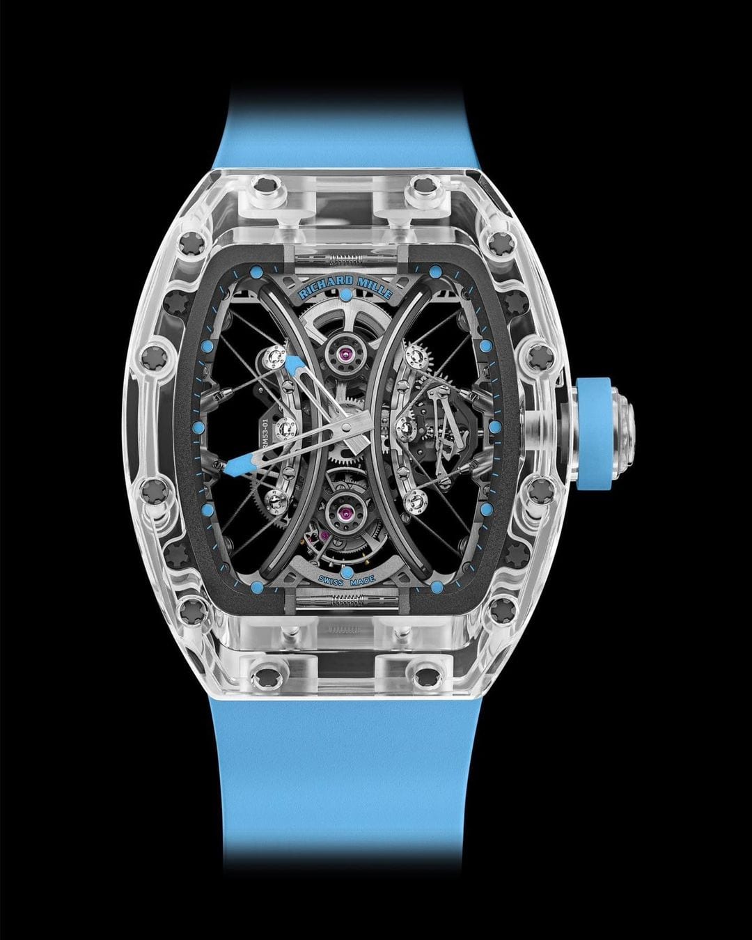 As the name already indicates, is this watch nearly the same as the RM 53-01 Tourbillon Pablo Mac Donough yet now fitted with a sapphire case. This case makes the watch considerably more challenging to make, as Mille crafts the bezel, caseband, and caseback, all from a single piece of sapphire crystal. As there are no polymers used, even the slightest error can ruin all the work. The case of the RM 53-02 is also curved, even further increasing the challenges of milling it. Knowing all this, it isn’t surprising that Mille needs a staggering 1,000 hours to craft one of these cases, on top of the four weeks required for the sapphire crystal to grow. However, the rewards make it all worthwhile, as the transparent case, secured with titanium screws, now allows you to admire the incredible movement from literally every angle.