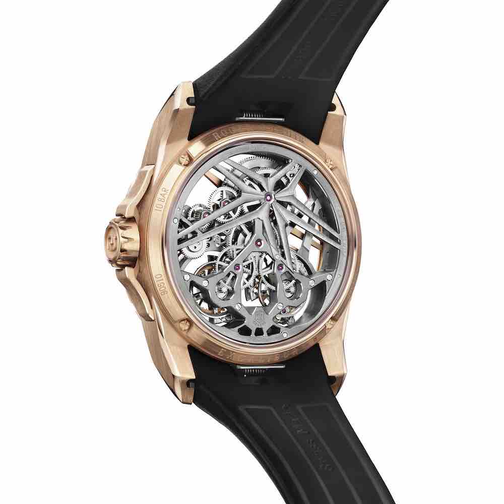Roger Dubuis also subtlely revised the design of the Excalibur Skeleton Double Flying Tourbillon. The star-bridge, a signature feature on this watch, now seems to float above the mainspring barrel, making it visually even more appealing than ever before. The case also has some new features, most distinctly the crown guards, which elegantly flare out of the case. Just make no mistake, while this Roger Dubuis is a complicated and very exclusive watch, it is meant for an active lifestyle. While not a sports watch per se it is water-resistant up to 100 meters. This also explains why the optional straps, which can be switched to easily and swiftly thanks to the quick-release system, include rubber and other water-resistant materials. The Excalibur Skeleton Double Flying Tourbillon’s exclusivity is further underscored by its rarity; Roger Dubuis is offering it in a limited edition of only 8 pieces in either white or pink gold, as well as a model set with baguette-cut diamonds.