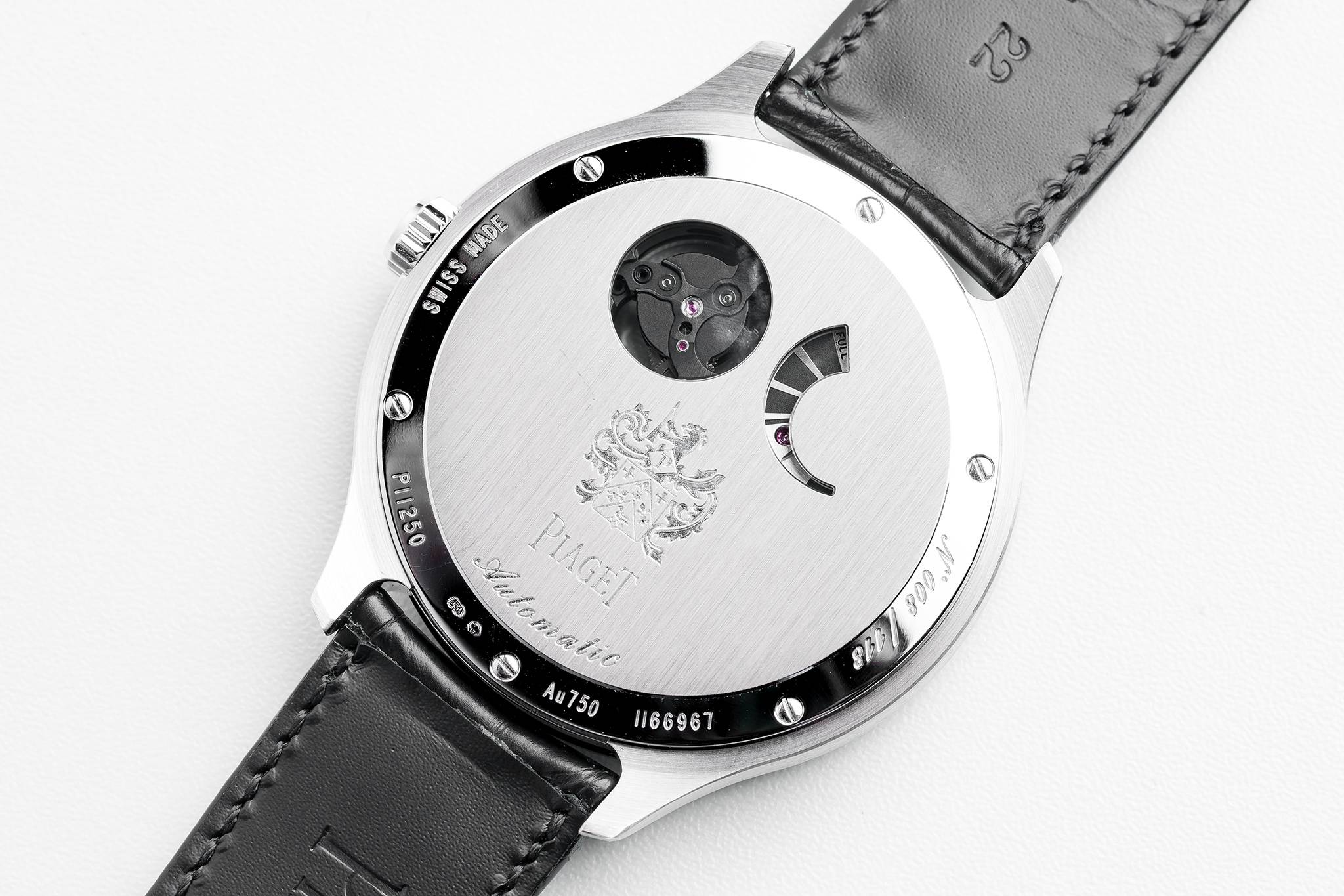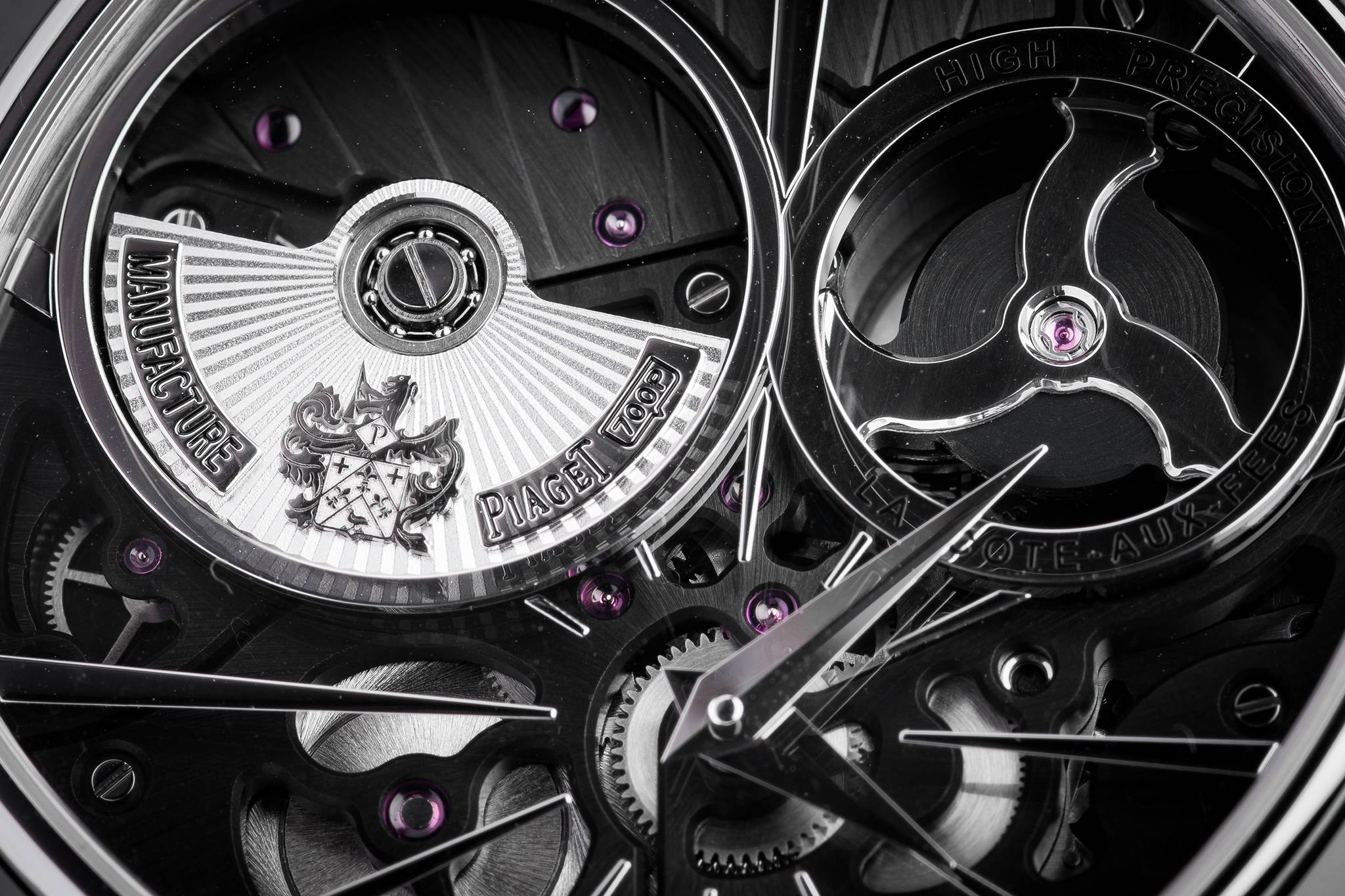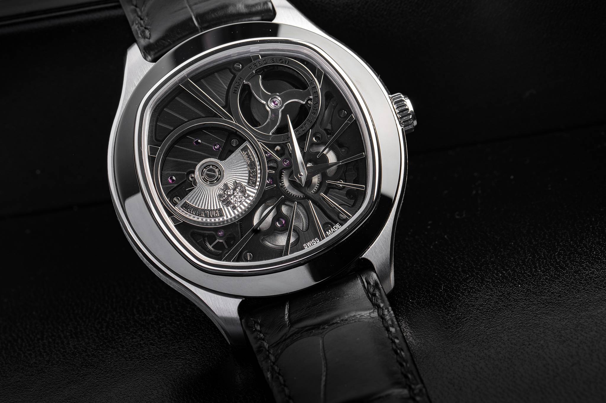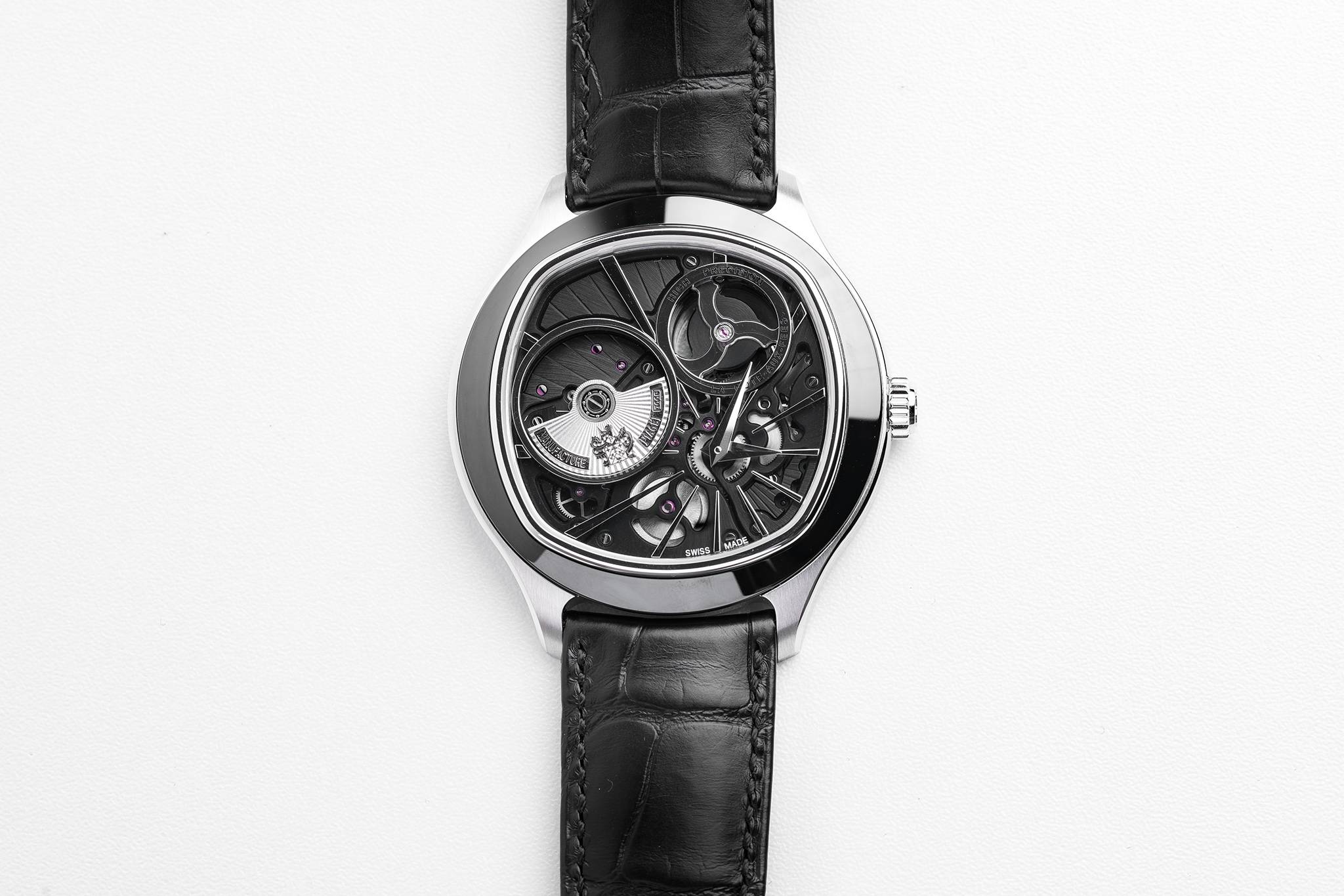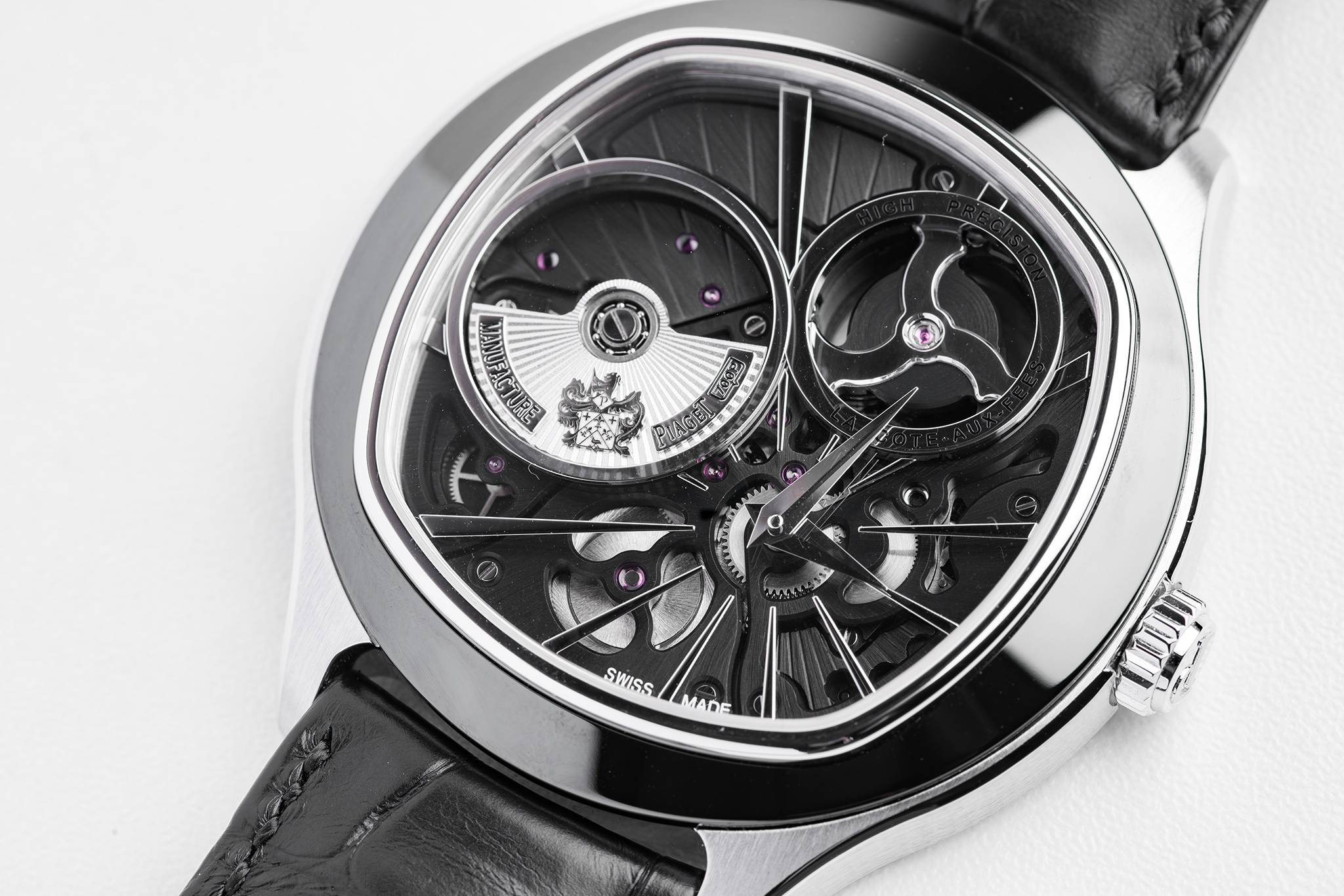 Housed in a 46.5 mm white gold cushion-shaped case, with rounded black ADLC coated bezel to match the black treated caliber, the also cushion-shaped movement’s main functional features are visible on the display side, thanks to its inverted structure and the absence of a dial, revealing the superior quality of Piaget finishing.
