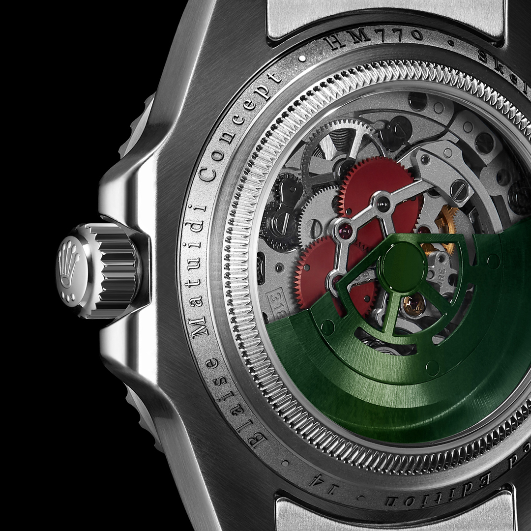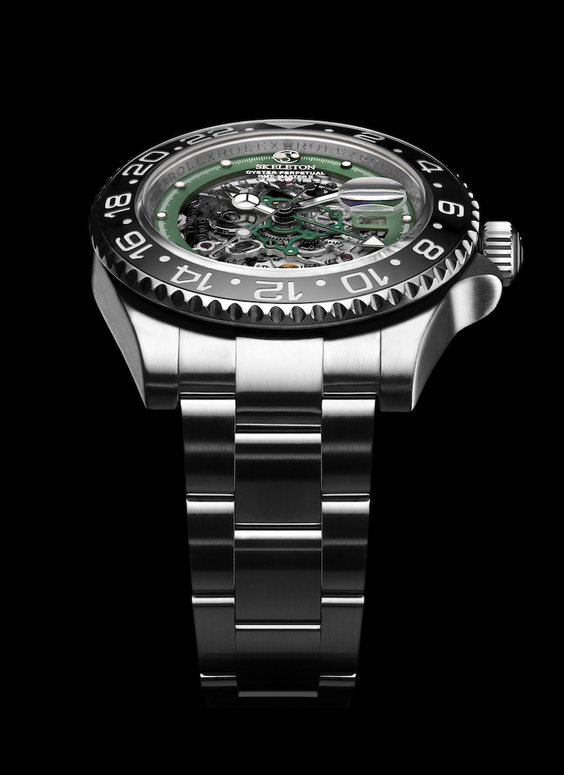 We also find green at the back of the watch, where Skeleton Concept replaced the closed caseback with a see-through one. Here we can admire more of the skeletonized movement, which gives the watch a tremendous amount of depth and a highly technical character. Skeleton Concept even went as far as opening up the barrel, allowing owners of this edition limited to 40 pieces to admire the mainspring. The ceramic bezel and robust Oyster-bracelet complement the sportive character of this timepiece. While a thing of beauty during the day, it is equally appealing at night because then the entire movement lights up. This shows a different side of the rich character of this exceptional creation.