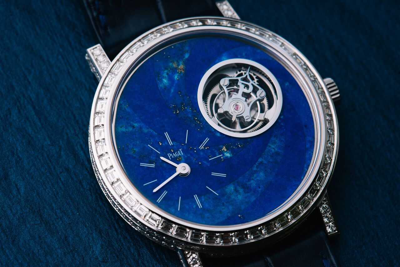 Yes, Piaget had more novelties this year than just the new Altiplano Ultimate 910P and the Altiplano Ultimate Concept. They also launched two new Altiplano Flying Tourbillons with stone marquetry dials. One of them uses Lapis Lazuli, which gives the watch a unique appearance. To make this Altiplano Flying Tourbillon, even more, an eyecatcher, did Piaget set the white gold case with diamonds.