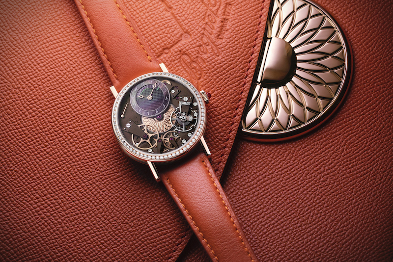 While the brand is known for its gold dials with engine-turned motifs, they have, in more recent years, also adopted Tahitian mother-of-pearl as a distinct element in their ladies’ collectsion. What is so unique are not only the deep and vibrant colors of this mother-of-pearl but also that Breguet can engine-turn this material as well, a very delicate operation. At 37mm is the new Tradition Dame 7038 a bit more modest in size, yet it makes quite the impression as its rose gold case is set with 68 brilliant-cut diamonds. It is matched not only by an orange calfskin leather strap but also with a clutch bag in the same color leather and with its clasp engraved similar to that of the mainspring barrel that comes with the watch, making it the perfect accessory for the summer.