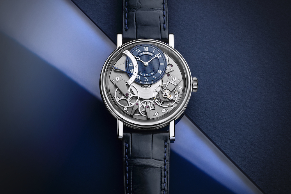 The first is the Tradition Automatique Seconde Rétrograde 7097, a watch that shows its mechanical parts in an unusual way. Most of the gear train can be admired at the front of the watch, crowned by an engine-turned blue dial. It still breathes the distinct style of the brands’ founder, Abraham-Louis Breguet, yet is, at the same time, surprisingly contemporary. This is not only thanks to the blue dial and matching strap but also to the white gold case with a 40mm diameter. This makes the watch perfectly proportioned. The front of the watch is a joy to look at, not only because of all the well-finished parts but also because of the motion of the balance wheel and gear train. Charming is also the retrograde secondes display, which is located on the left side of the dial. It adds a sense of dynamic that shows the versatility of the Breguet design language.