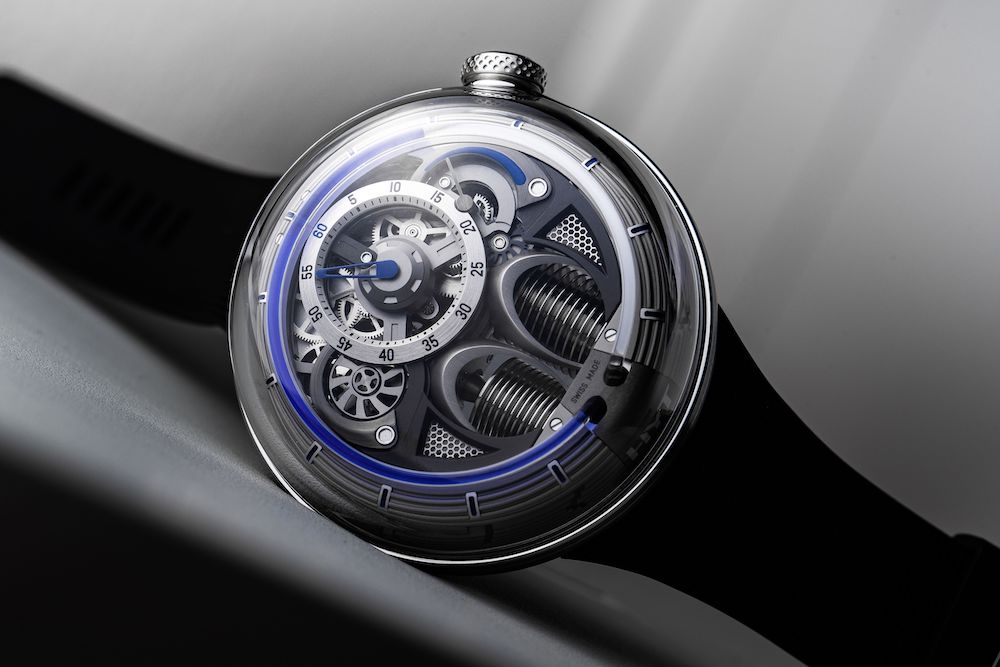 Its case is little more than a stainless steel base, on some models with either anthracite or PVD coating, to which the rubber strap is connected and where the highly domed sapphire crystal in is secured. Underneath we find not only the movement, with its two bellows that pump the fluids around but also the ribbed ring that surrounds it and in which the Arabic numerals are cut that indicate the hours. It is needless to say that this all results in a watch that has, above all, a very three-dimensional presence.