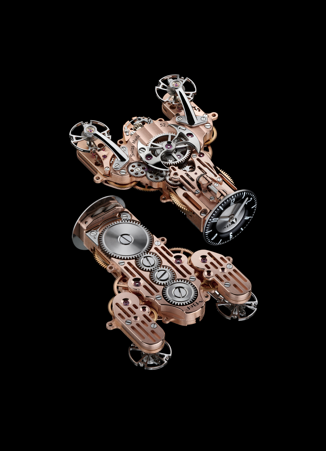 The ‘pods’ on each side of the main body of the HM9 contain a balance wheel, which can be admired through a sapphire window. The rate of them is balanced out by a planetary differential, that is located in the central body of the watch, and displayed at the front of the watch. MB&F will launch the HM9 ‘Flow’ in two editions of 33 pieces each, that share the titanium case. The ‘Air’ edition features a dark finish on the movement and a dial in aviator-style. The ‘Road’ edition pays tribute to 1950’s cars with a speedometer inspired dial, and a rose gold plated movement. Both are priced at US$ 182,000 + tax.