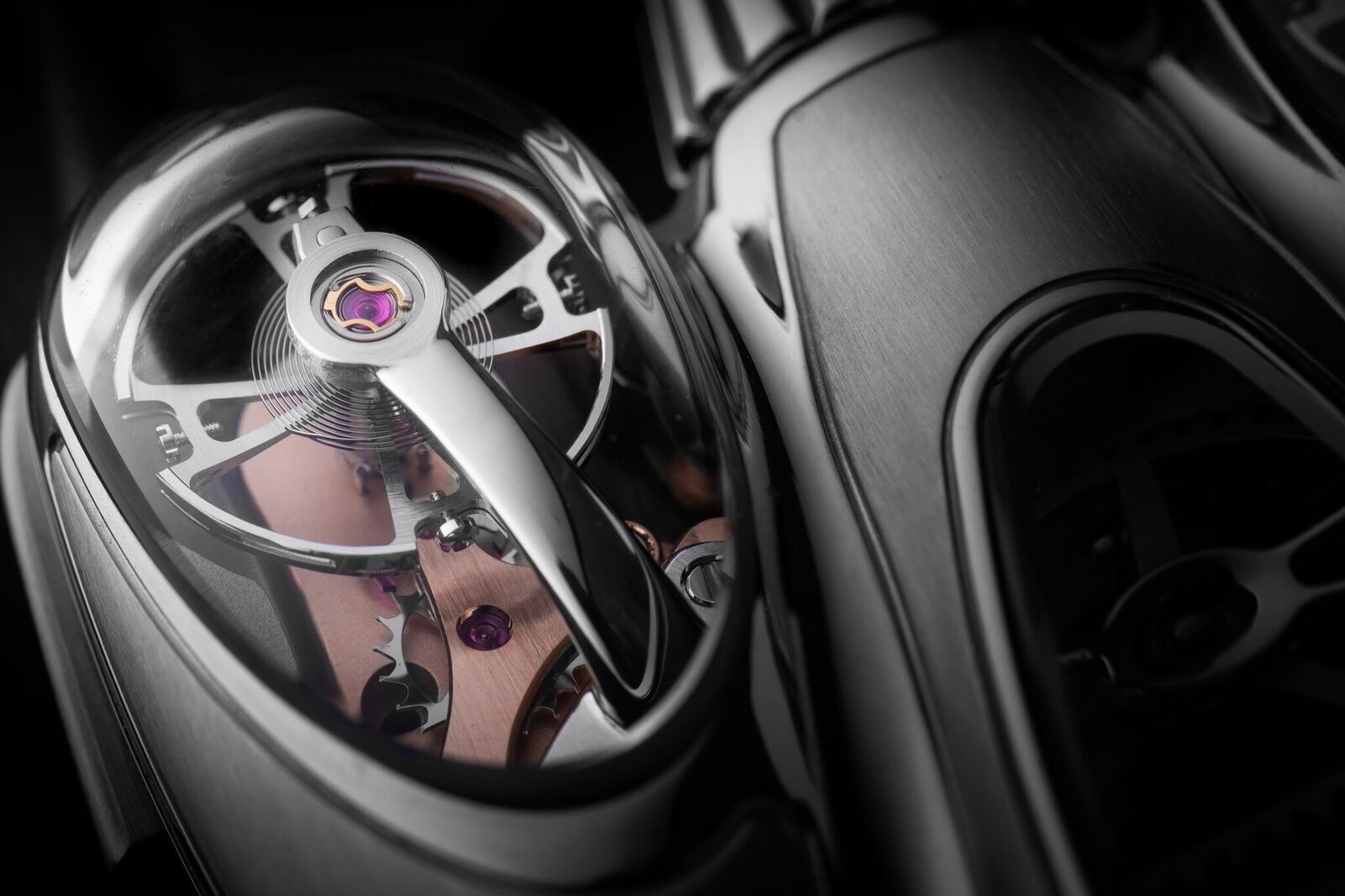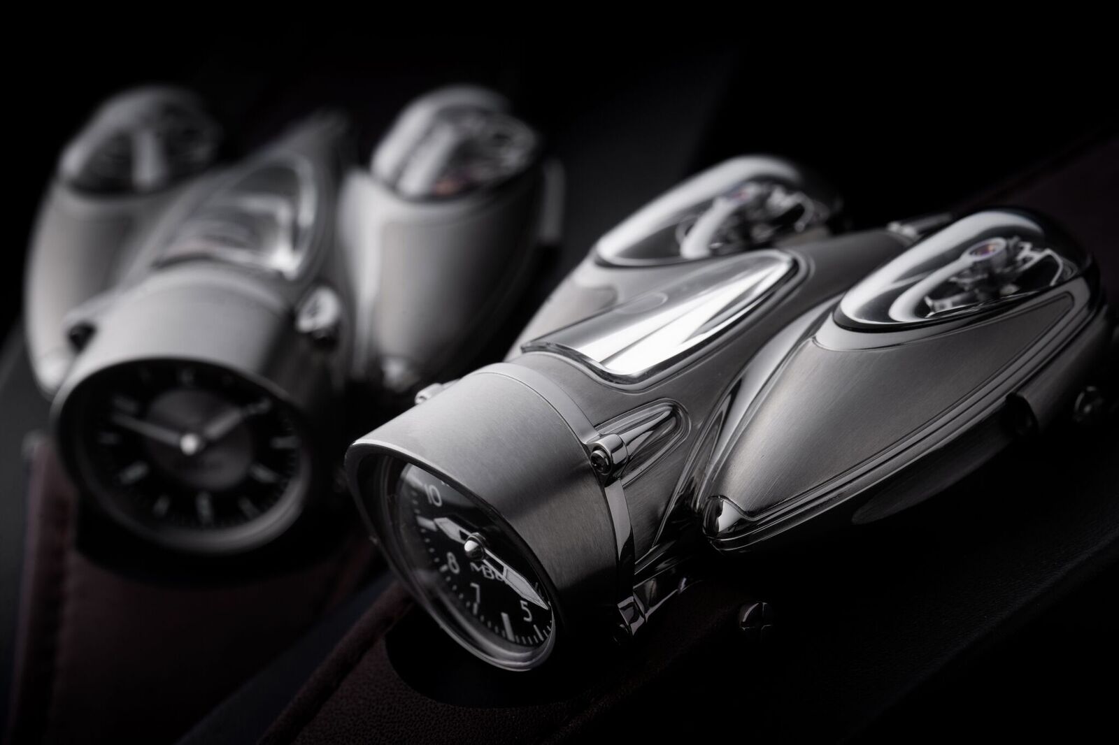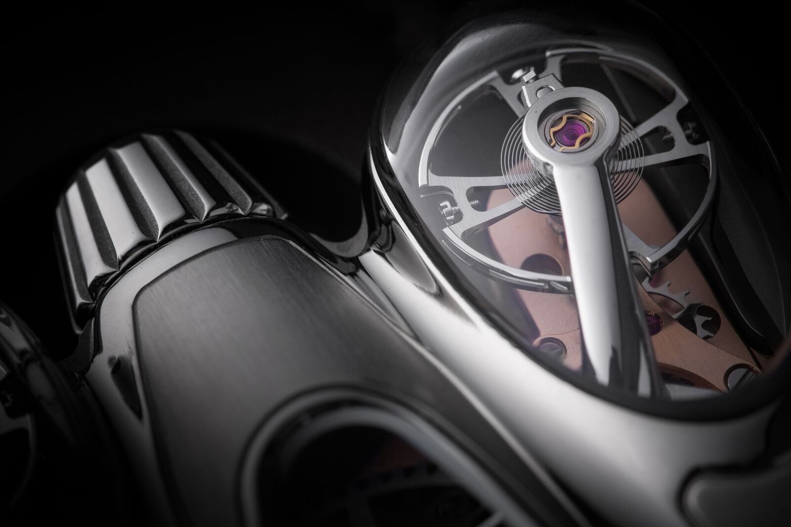 The HM9 can only be mistaken for an MB&F creation. Its organic shapes, penned down by designer Eric Giroud, are unlike anything there has been before yet at the same time convey the familiarity that all MB&F’s creations seem to possess. The case is sculpted (even the term ‘crafted’ seems highly inadequate in relation to this watch) from titanium, combining a satin and polished finish. The full name of this new creation is Horological Machine N°9 ‘Flow,’ for obvious reasons, but its shape is not just there to be pretty but houses a unique movement of which its complexity only rivals with its beauty.