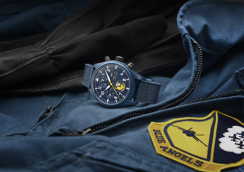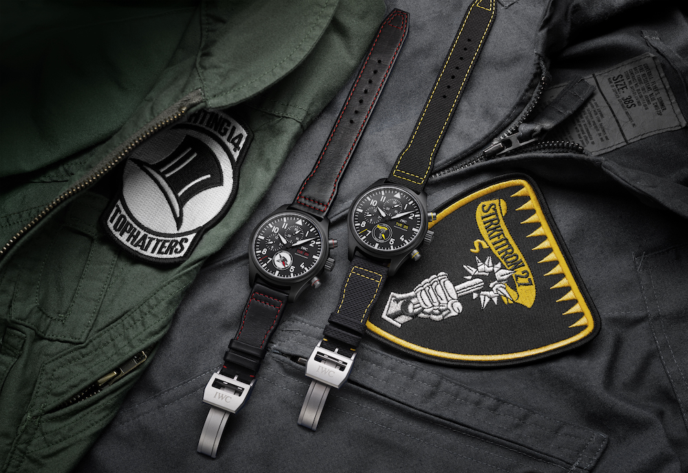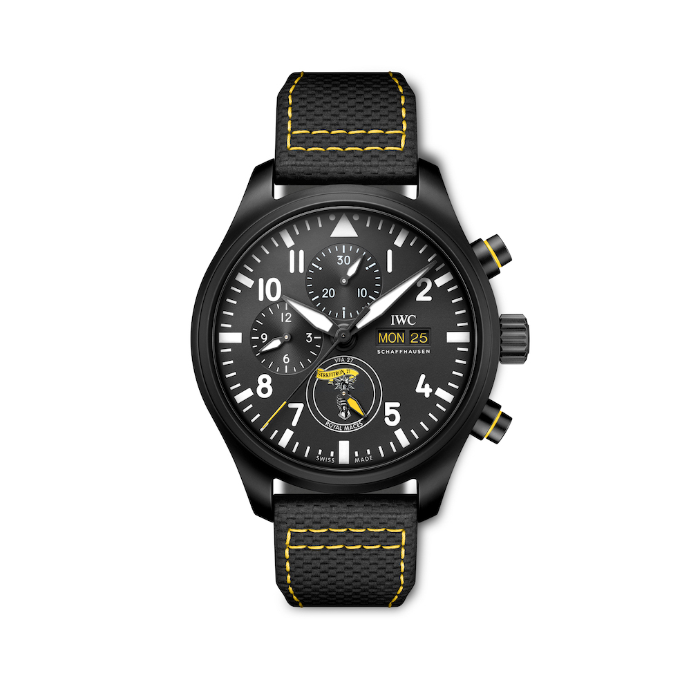 The Pilot’s Watches Chronograph Editions are dedicated to the “Royal Maces,” “Tophatters,” and “Blue Angels®”. The emblem of these squadrons is placed in the subdial for the running seconds at six o’clock. IWC further cleverly integrated the color codes of each squadron into the watch. The one for the “Royal Maces,” stationed at Marine Corps Air Station Iwakuni in Japan, combines a black zirconium oxide ceramic case with a caseback in grade 5 titanium. That is also the place where we find an engraving of the squadron’s F/A-18E Super Hornet jet. Yellow, the color of the “Royal Maces,” is integrated not only in the stitching of the strap and the hands but also on the day and date indication.
