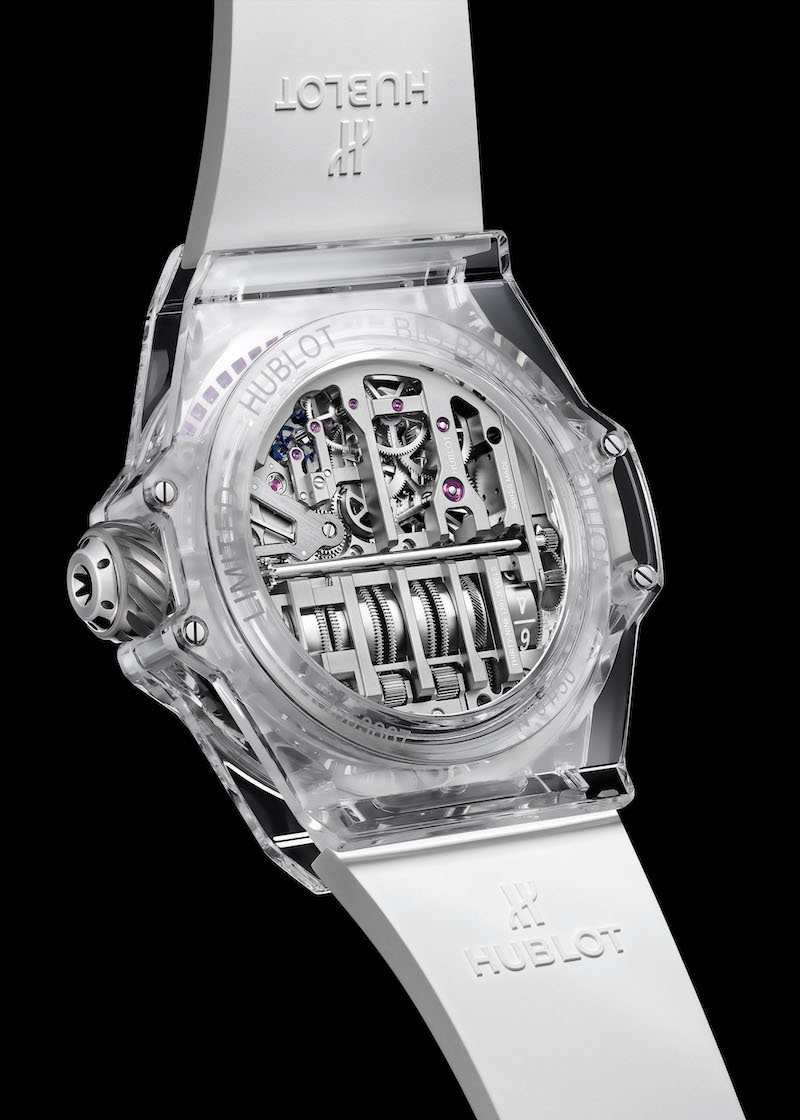 Hublot has been one of the pioneers in creating watches with their cases made from sapphire crystal. While the brand is now capable of making them in a wide variety of colors, they choose transparent for this one. It is a superb choice as it offers balance in combination with the movement, while the rainbow set bezel becomes the center of attention. An added advantage is that the caliber that powers this MP-11 can also be admired from nearly all angles.