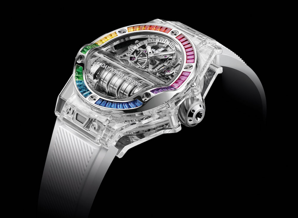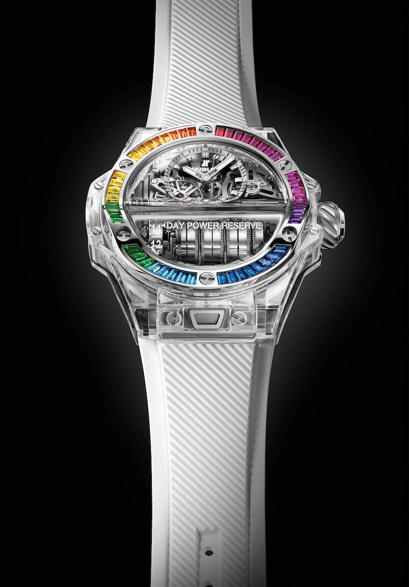 As a serial innovator, Hublot has made its mark on quite a variety of different fields and technologies. This resulted in exceptional watches and many world’s first. It gets even better when the brand combines areas in which they are a trailblazer, like sapphire crystal and rainbow settings. Both join forces in the Big Bang MP-11 Power Reserve 14 Days Sapphire Rainbow, taking this complicated timepiece to the next level.