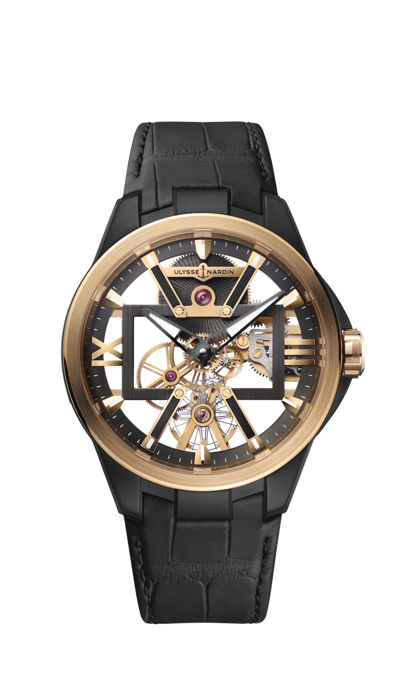 Priced at $25,000 USD, and only available at Watches of Switzerland, the Executive Skeleton X WOS Limited Edition is 42mm in diameter and features Ulysse Nardin caliber UN-371. This manual wind movement shows it all in a modern configuration. A particular pleasing detail is the silicium balance wheel. It is fitted with stabilizing micro-blades and nickel flyweights, and Ulysse Nardin first introduced it in the revolutionary Freak Vision.