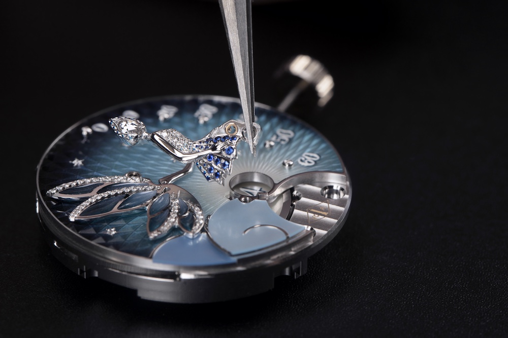 One of the first things that become clear when seeing the watch is the incredible amount of depth that there is to it. This is because Van Cleef & Arpels puts a significant amount of work into creating several layers of artistic expression that combined form the image. This starts with the background, formed by an expressive guilloche motif, which goes from almost white to deep blue. On top of this, clouds made from white gold with mother-of-pearl are placed, on which the fairy seems to sit. Her wings are made from white gold with a combination of grisaille enamel on plique-à-jour enamel. It is the first time that Van Cleef & Arpels uses both these techniques in a single motif. The fairy’s wings and clothing are set with diamonds and sapphires, while a rose-cut diamond forms her head.